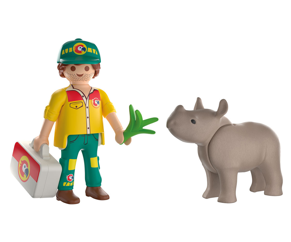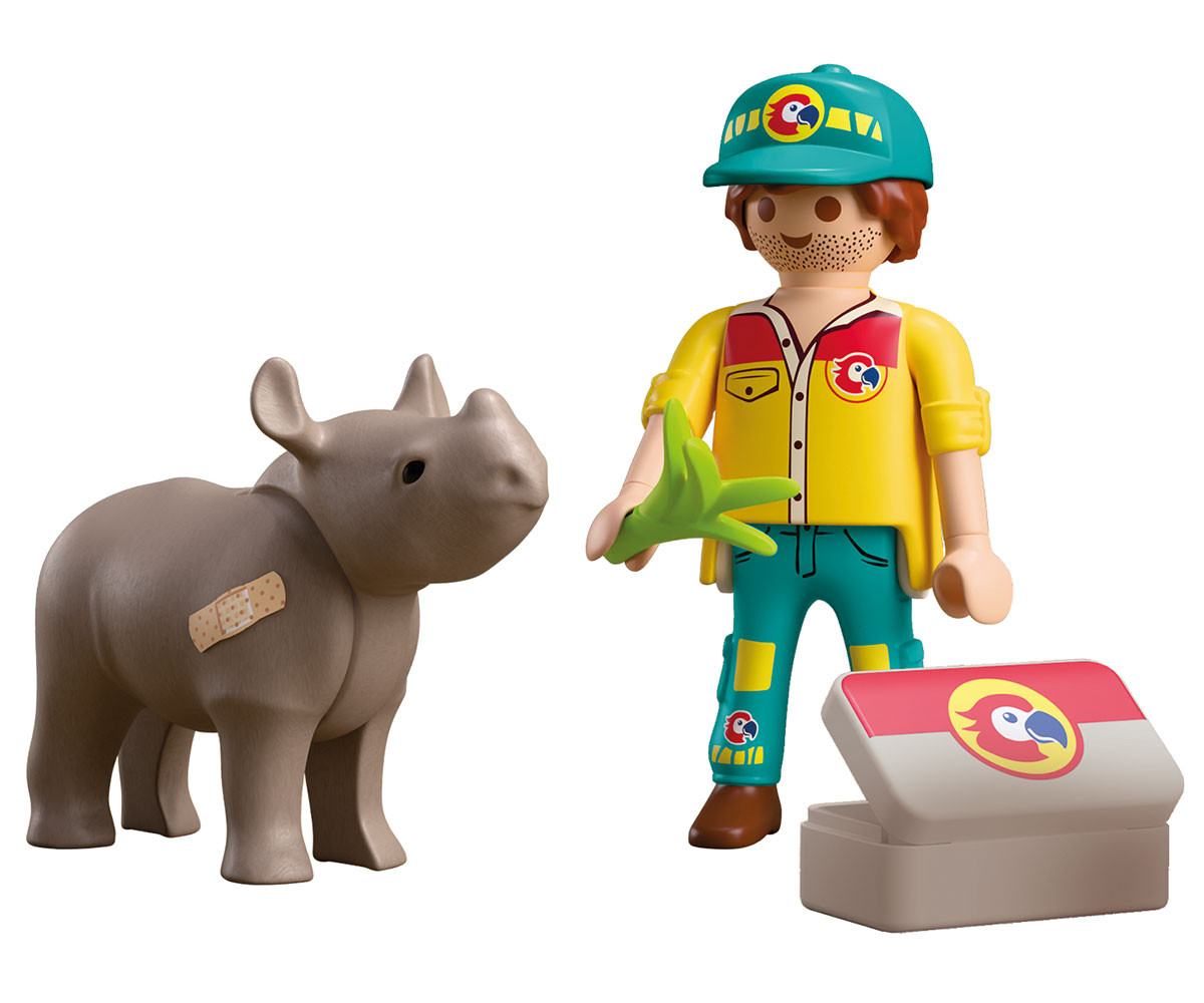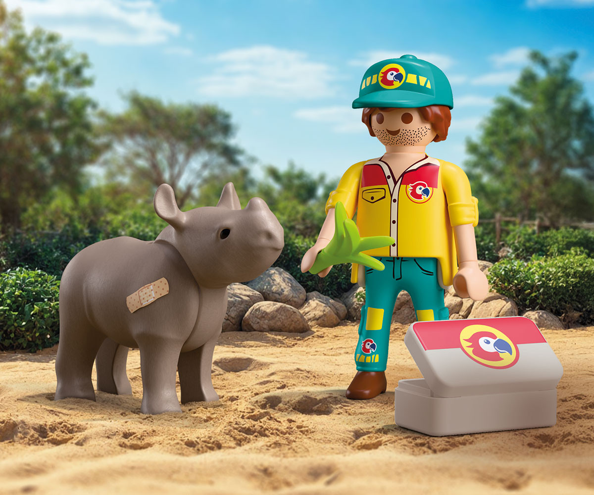 В модерния и просторен зоопарк в Playmo-City рейнджърът се грижи за болно носорогче. То не иска да се храни и се е наранило при падане - но със специална храна, превръзки и много грижа, милото животно скоро ще се почувства по-добре и ще се изправи отново на крака. С внимателни ръце и удобен медицински комплект рейнджърът веднага започва да помага на малкия носорог да се възстанови и да се почувства отново в безопасност. Децата могат да се включат в грижите за пациента с цветни стикери за превръзки и да накланят главата му, за да оживее сцената. Този трогателен комплект PLAYMOBIL DuoPack насърчава грижовната игра и въображаемите приключения в зоопарка. Прекрасно допълнение към всяка колекция PLAYMOBIL с диви животни - идеално за малки любители на животните и бъдещи пазители на природата!