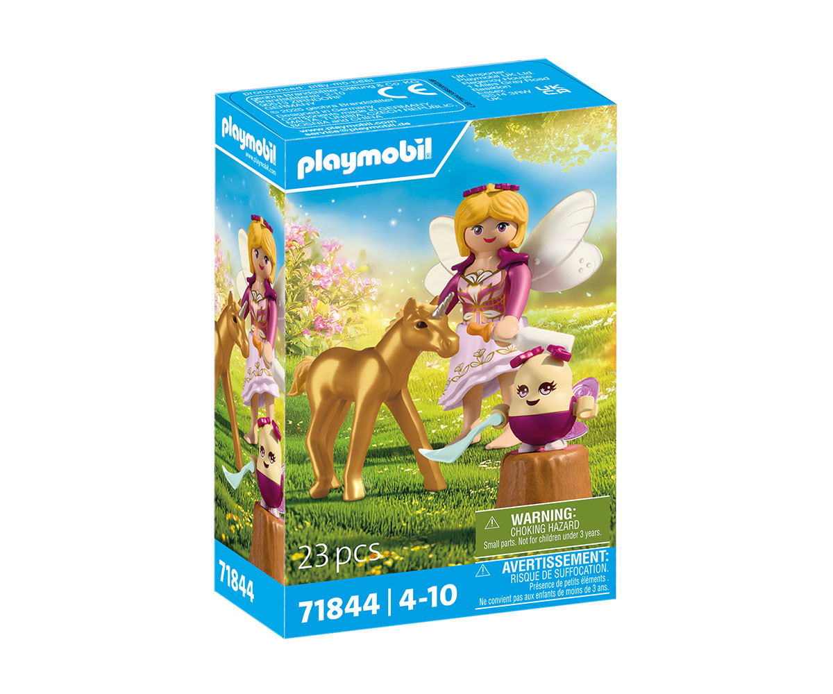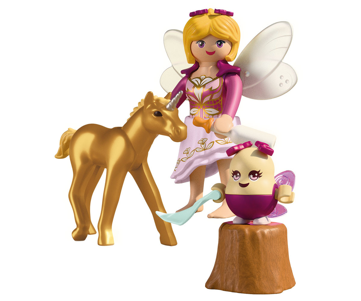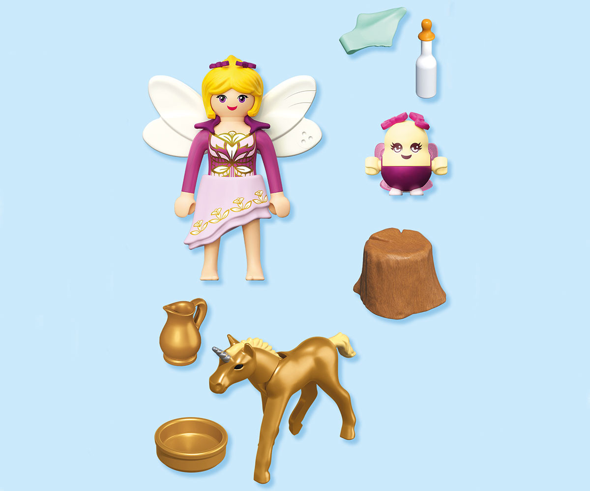 Каква изненада! Редкият Златен еднорог е родил малко жребче. Феята и нейният малък помощник Joyling се грижат с много любов за новороденото. Открийте магическата връзка между феята и нейния нов приятел и станете част от тази приказна история! В Кралството на еднорозите се е появило истинско златно чудо! С блестяща козина и искрящи очи, златното бебе еднорог е обгрижвано внимателно от нежна фея и нейния весел помощник Joyling. От хранене с бутилка до гушкане върху малко пънче - всеки момент е изпълнен с топлина и магия. Този очарователен PLAYMOBIL комплект включва вълшебни аксесоари като кана, бутилка за мляко и блестящи фейски крила. Перфектен за разказване на приказни истории и вълшебни игри, той позволява на децата да създават свои собствени магически приключения.