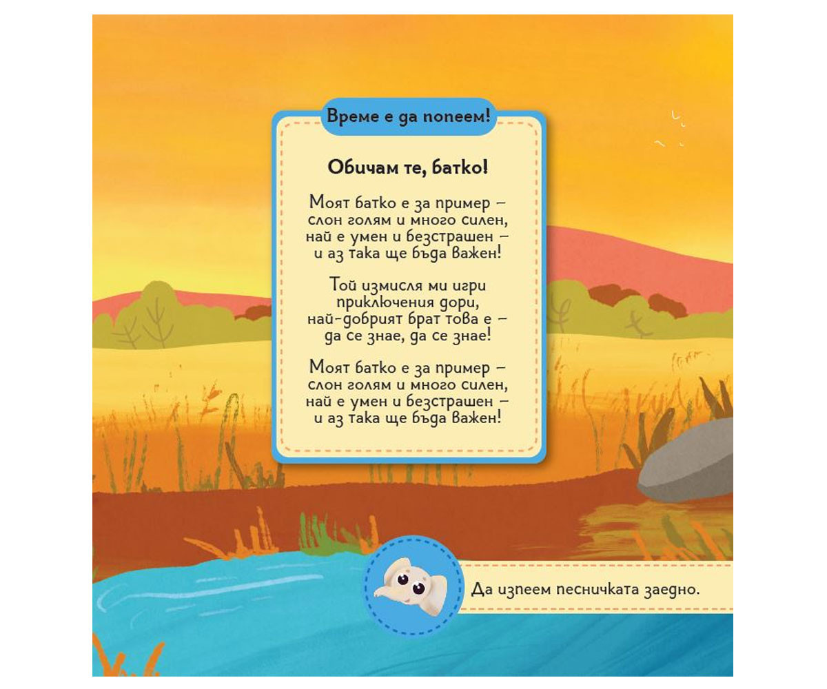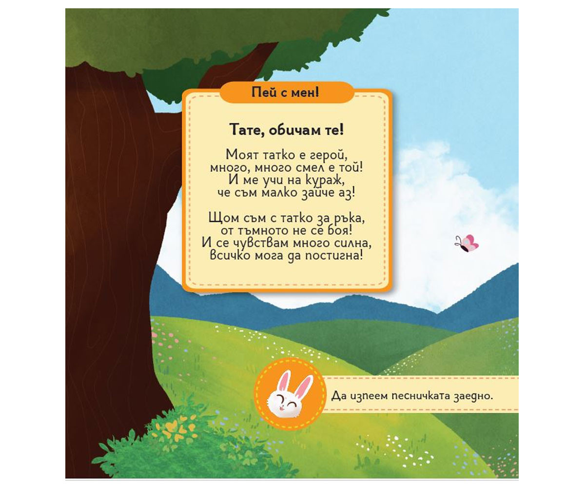 Музикална книга с пет песнички, посветени на обичта към мама, татко, кака, баба и батко.