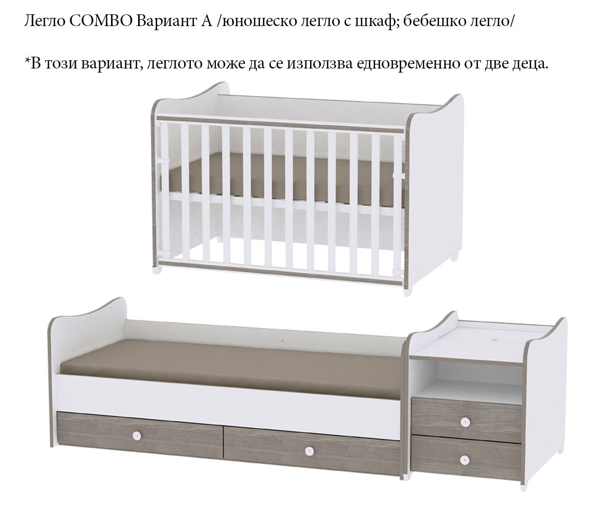 - Вариант А /юношеско легло с шкаф; бебешко легло/ *В този вариант, леглото може да се използва едновременно от две деца;