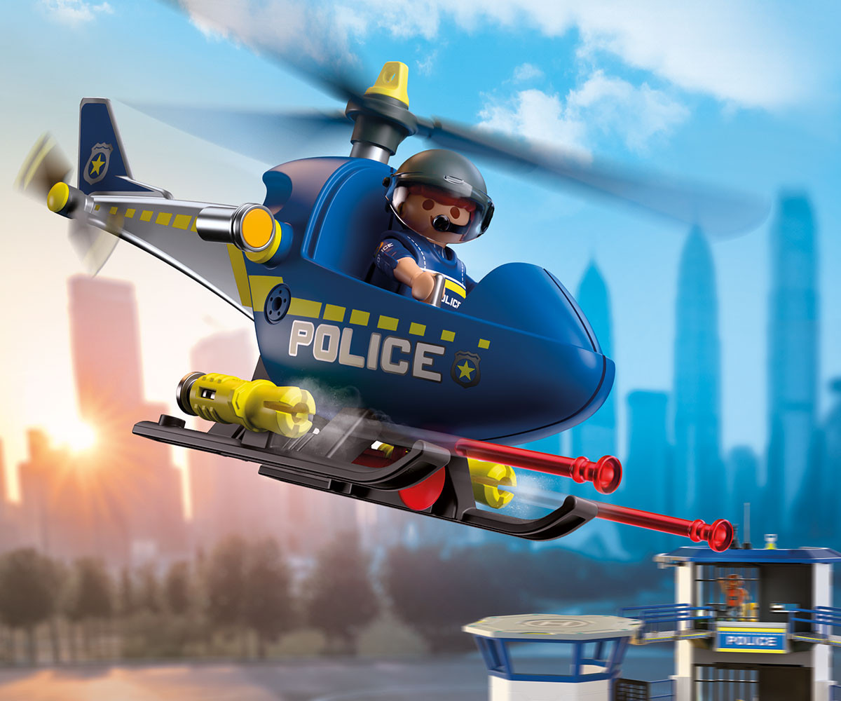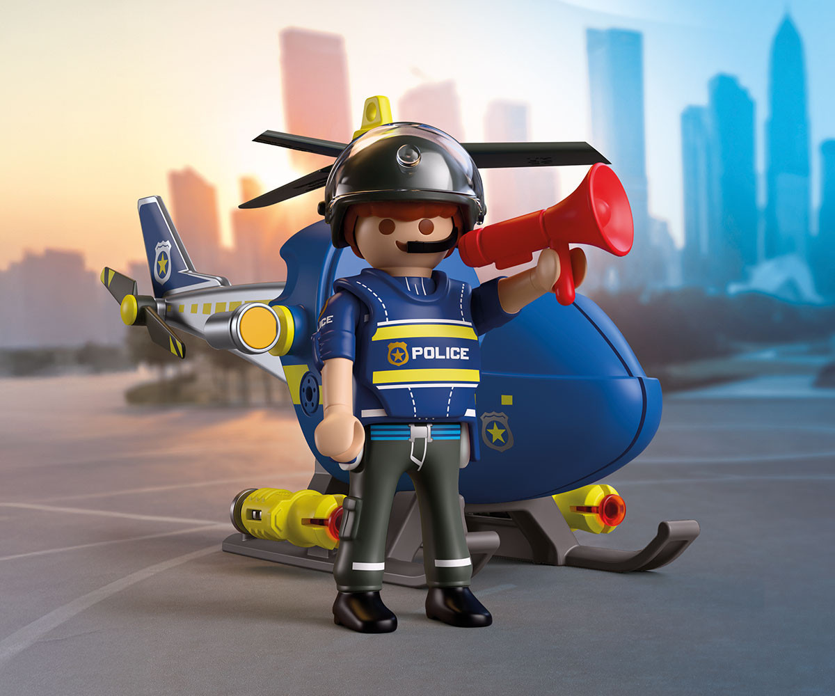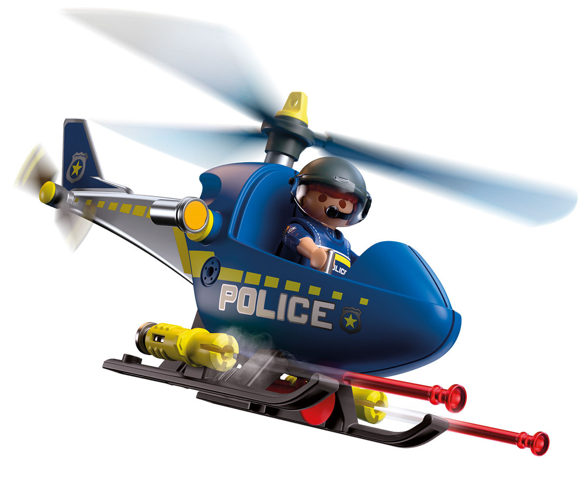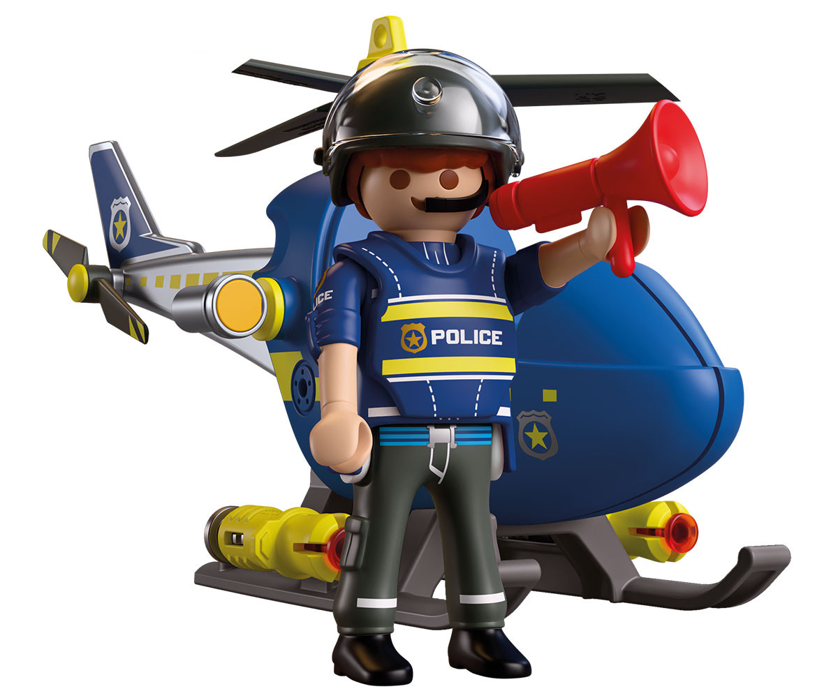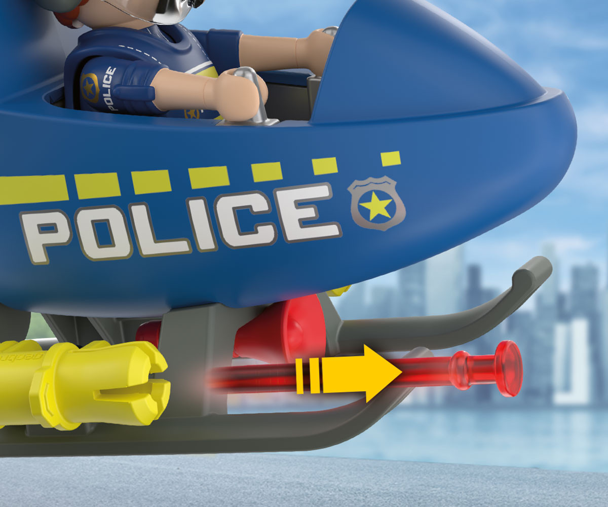 Полицейският служител патрулира над щаба в ранните сутрешни часове, следейки за избягали престъпници. Перките на хеликоптера се въртят бързо във въздуха. Изведнъж полицаят забелязва заподозрян, който бяга в далечината. Той веднага грабва мегафона и му нарежда да спре. С рязък завой полицаят насочва хеликоптера в позиция за действие и активира странично монтираните оръдия, за да помогне за спирането на бягството. Снарядите са заредени и готови, добавяйки още повече вълнение към всяка мисия в света на PLAYMOBIL. От високо над града всяка сцена от преследването оживява, докато въображението полита. Този динамичен комплект PLAYMOBIL предлага вълнуващи полицейски приключения във въздуха и е впечатляващо допълнение към всяка колекция PLAYMOBIL.