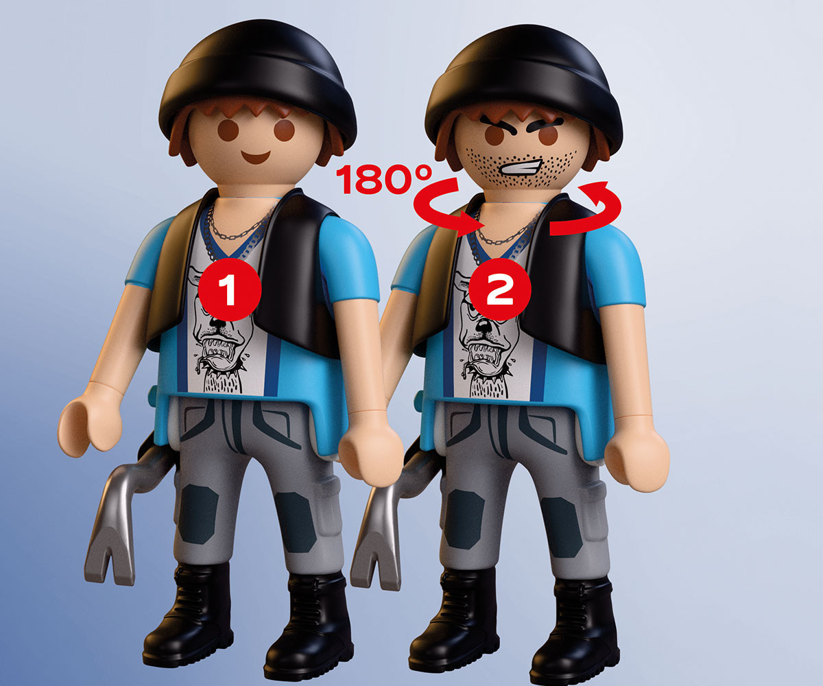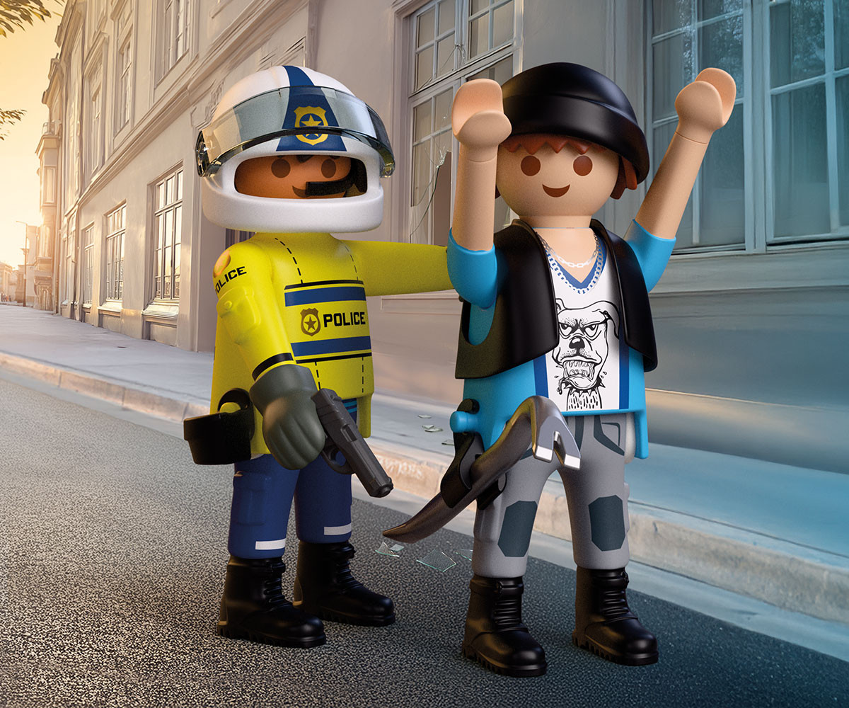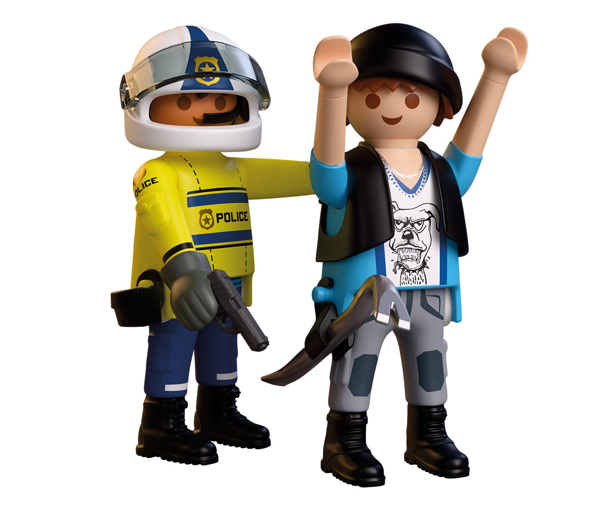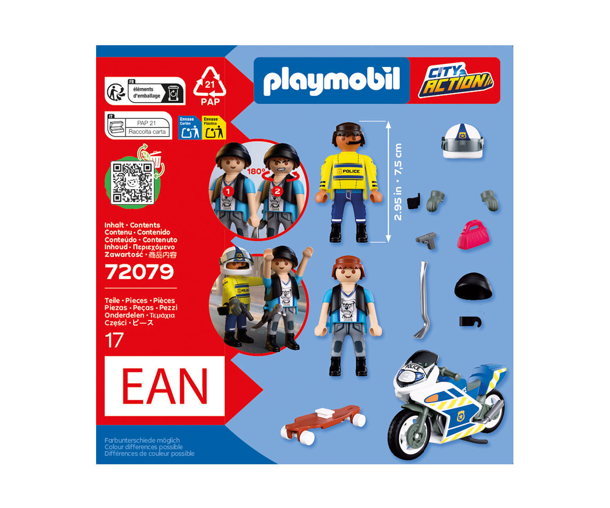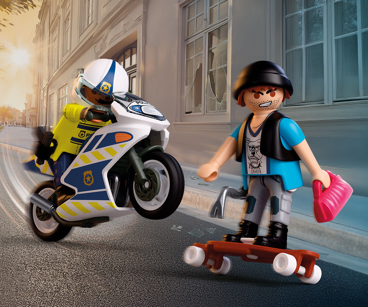 Посред бял ден крадецът разбива прозореца на апартамент на първия етаж с помощта на своя лост. Той грабва дамска чанта и побягва със скейтборда си. Но полицай на мотоциклет вече е по следите му. Преследването с мотоциклет се разгръща из града, докато решителният полицай се приближава все повече до хитрия крадец. Ще успее ли откраднатата чанта да бъде върната навреме? Мотоциклетът разполага със сгъваема стойка, която го държи стабилен по време на бързи спирания, а фигурката с въртяща се глава добавя още повече драматичност към всяка сцена. Този вълнуващ комплект PLAYMOBIL включва две фигурки, свалящ се лост с държач и множество аксесоари за динамична и изпълнена с действие игра. Създавайте нови смели сцени и вълнуващи приключения със света на PLAYMOBIL!