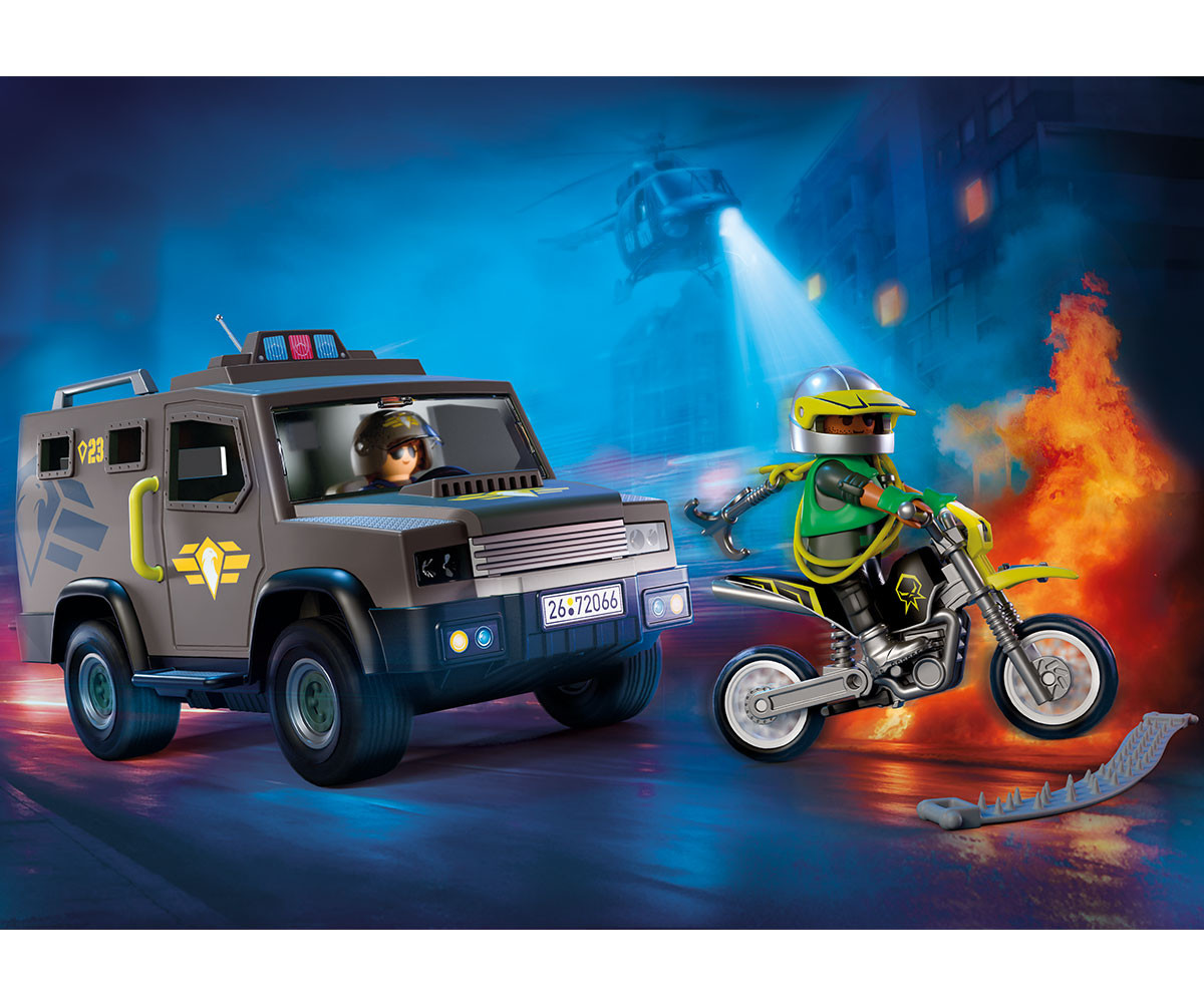 SWAT автомобилът се втурва към мястото на събитието - тактическия полицейски отряд е готов за действие! Междувременно хитрият престъпник бяга с мотоциклета си - с кука за захващане на колана, готов за нова серия обири! Но полицията е по следите му. Ще успеят ли да го спрат навреме? Започва високоскоростна игра на котка и мишка… Светлините проблясват, двигателите реват и преследването се превръща в напрегната гонка на пълна скорост. С бърза тактика и мощно оборудване специалният тактически полицейски отряд на PLAYMOBIL се приближава към престъпника, превръщайки всяка сцена в истинско екшън приключение. Децата могат да организират смели пътни блокади, зрелищни арести и динамични екипни мисии. Този детайлен комплект PLAYMOBIL включва SWAT полицай, престъпник, автомобил със свалящ се покрив, отварящи се задни врати и мигаща светлинна сигнализация, мотоциклет, лента с шипове, белезници и множество аксесоари за вълнуващи приключения.