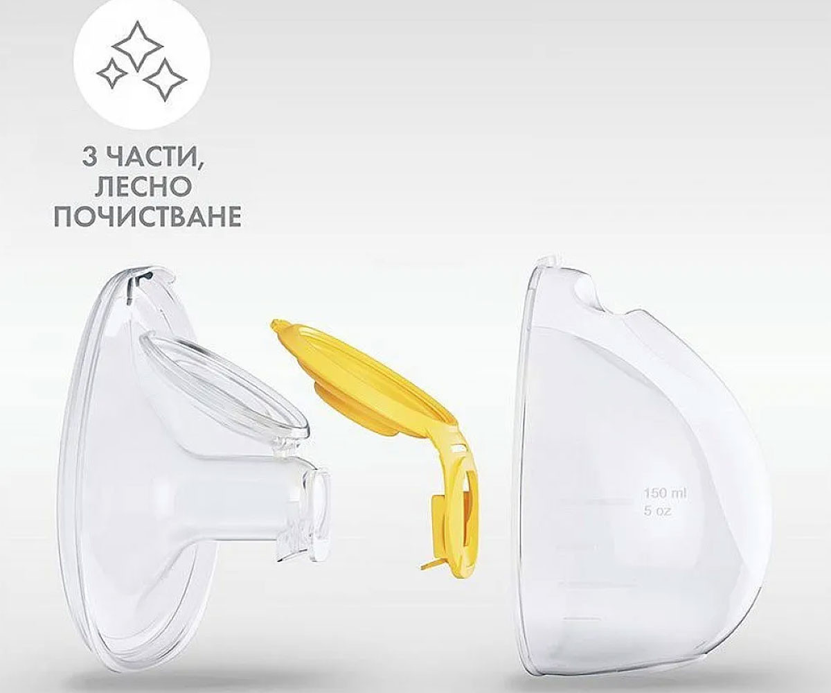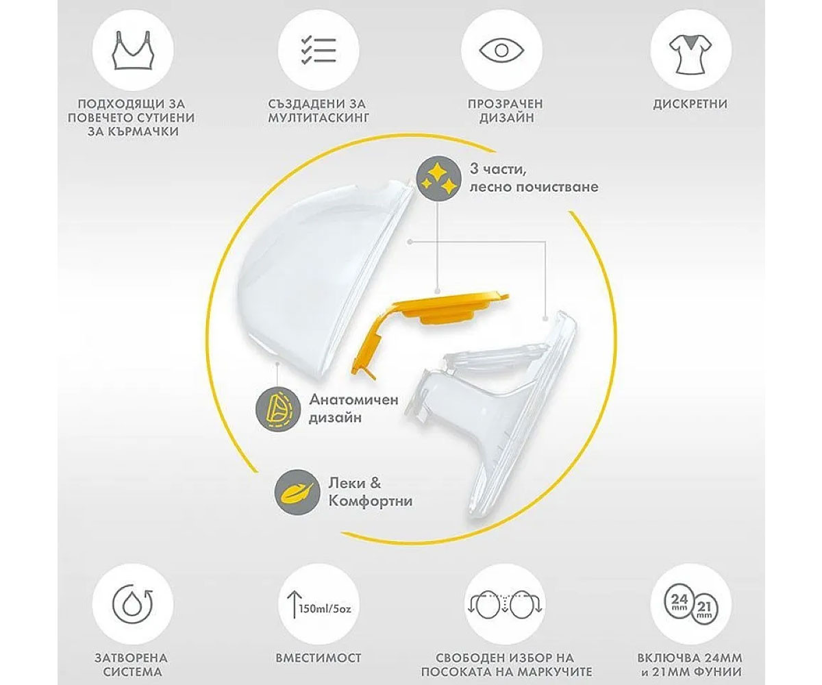 - Проектирана да пасне на формата на гърдите ви, за да поддържа ефективно изцеждане на мляко и максимален комфорт.