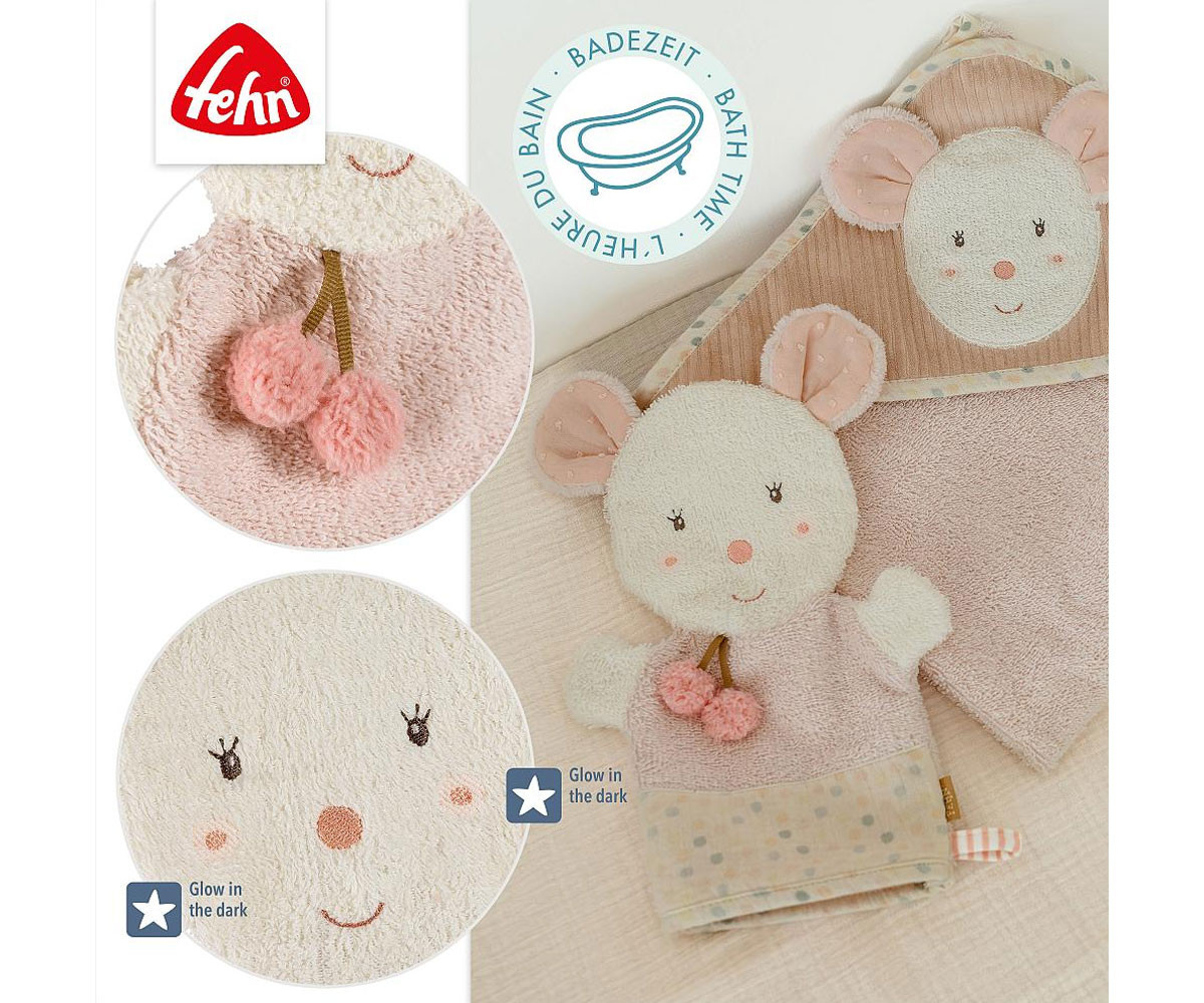 Този очарователна ръкавичка „Мишка“ от колекцията fehnLAND осигурява несравнимо удоволствие от банята с мек материал и чудесни цветови акценти. Така ежедневното миене става забавление за всяко бебе. Бебешката ръкавица може да се използва не само за къпане, но и като кукла за театър – просто я сложете и сладката мишка оживява бързо. Бродерията „Glow-in-the-dark“ свети в тъмното. Меката хавлиена тъкан е изключително нежна към кожата на бебето и почиства внимателно, като същевременно осигурява много игриво забавление.