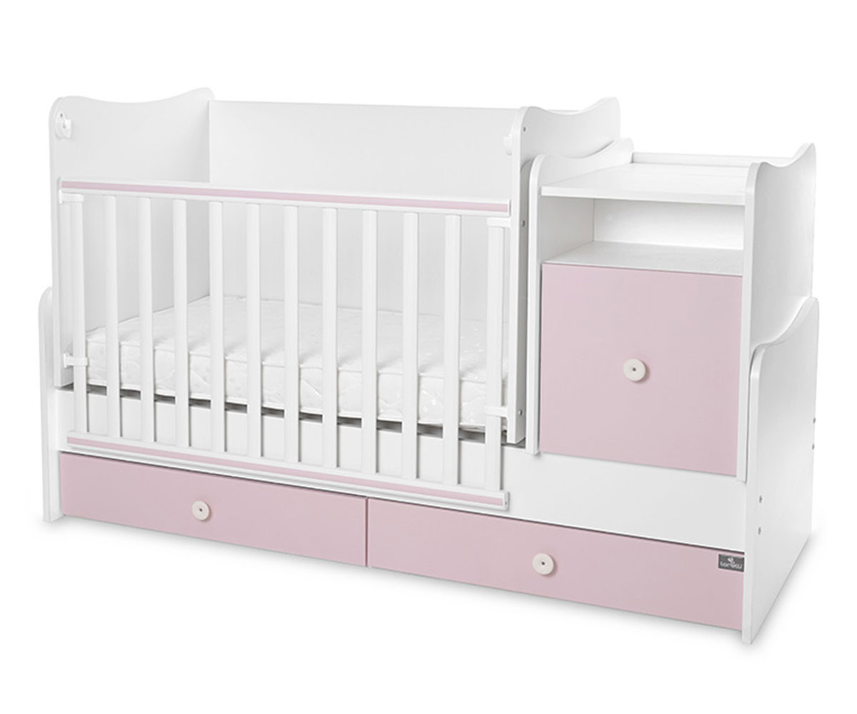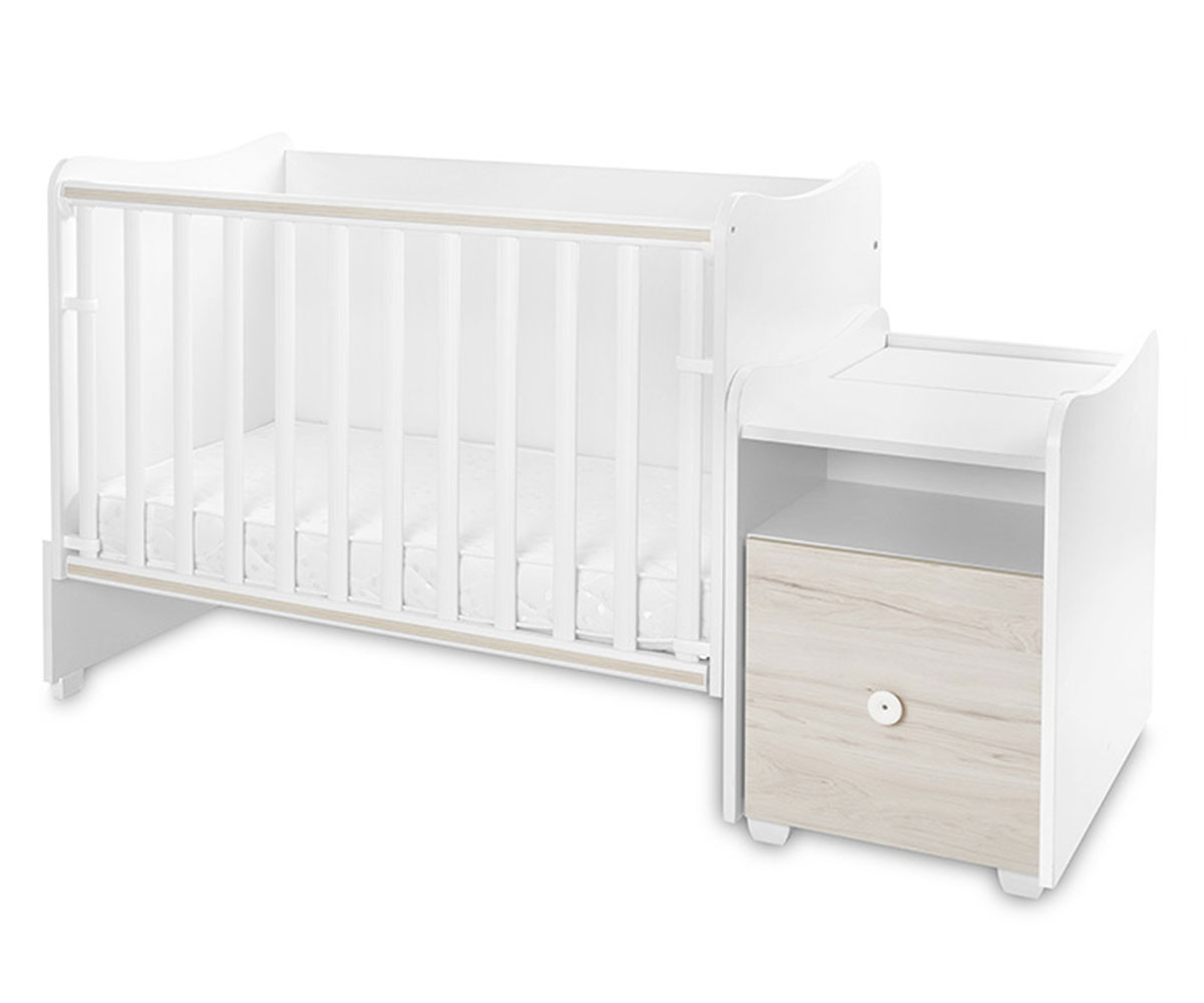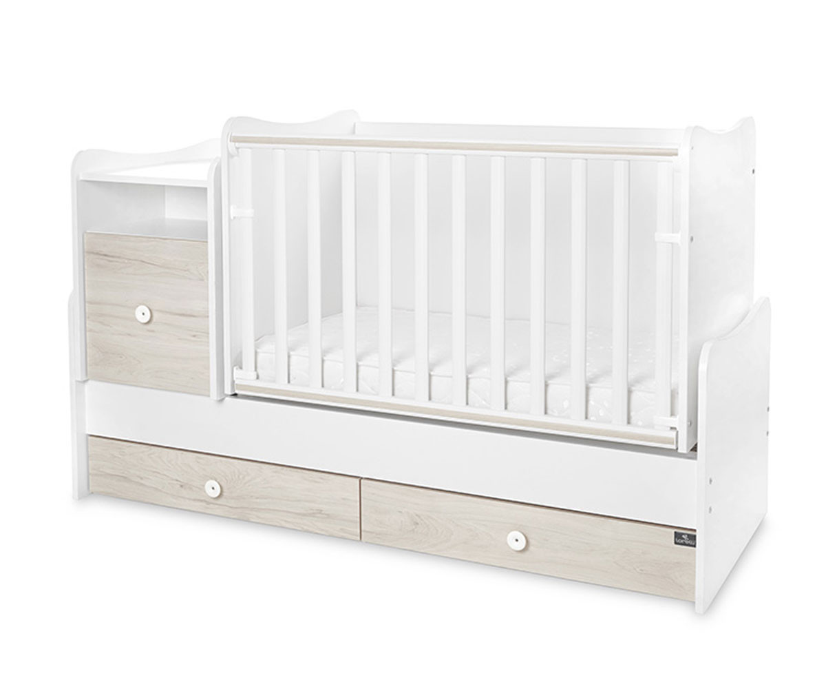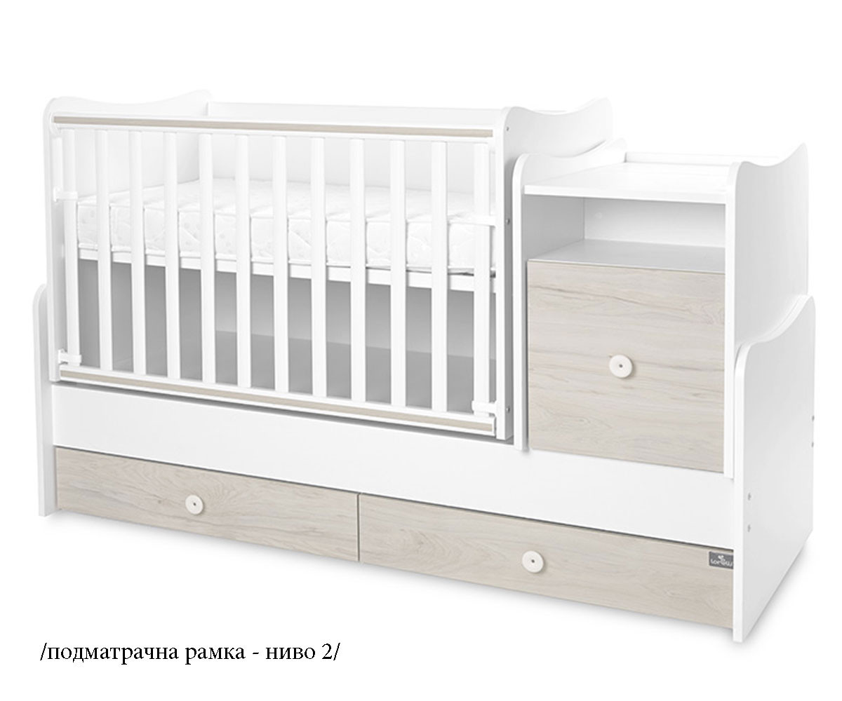 Детското трансформиращото се легло Trend Plus на Lorelli е практично и дългосрочно решение за Вашето дете. Включва кошара с функция люлка и възможност за фиксиране, многофункционален шкаф, който може да монтирате и от двете страни на кошарата и две големи чекмеджета, където детските принадлежности ще са Ви винаги под ръка. Бебешката кошарка е оборудвана с подматрачна рамка с две позиции и асансьорна решетка с две нива и автоматично фиксиране в горно положение. Многофункционалният шкаф е с плот за повиване, 2 рафта и ракла с капак с вградена дръжка и безшумно затваряне. С порастването на детето креватчето може да се трансформира в юношеско легло с бюро и шкаф. При появата на второ дете в семейството Trend Plus може да превърне в комбинация от бебешка кошарка с шкаф и юношеско легло.