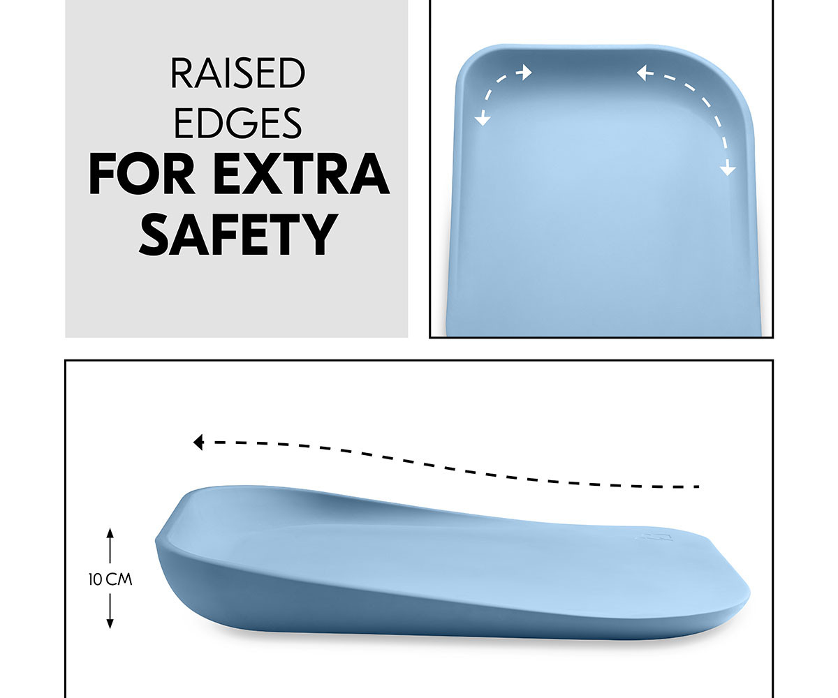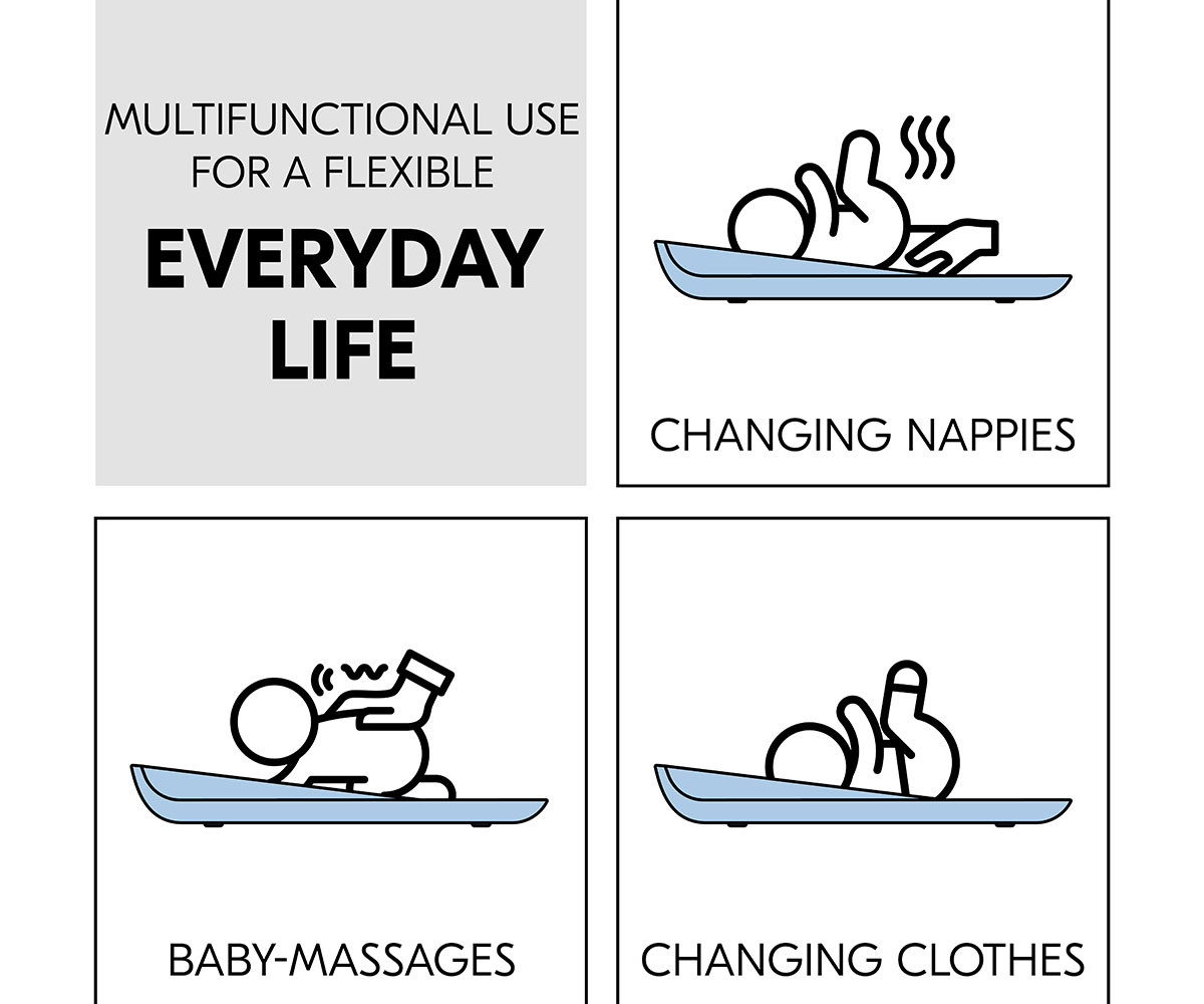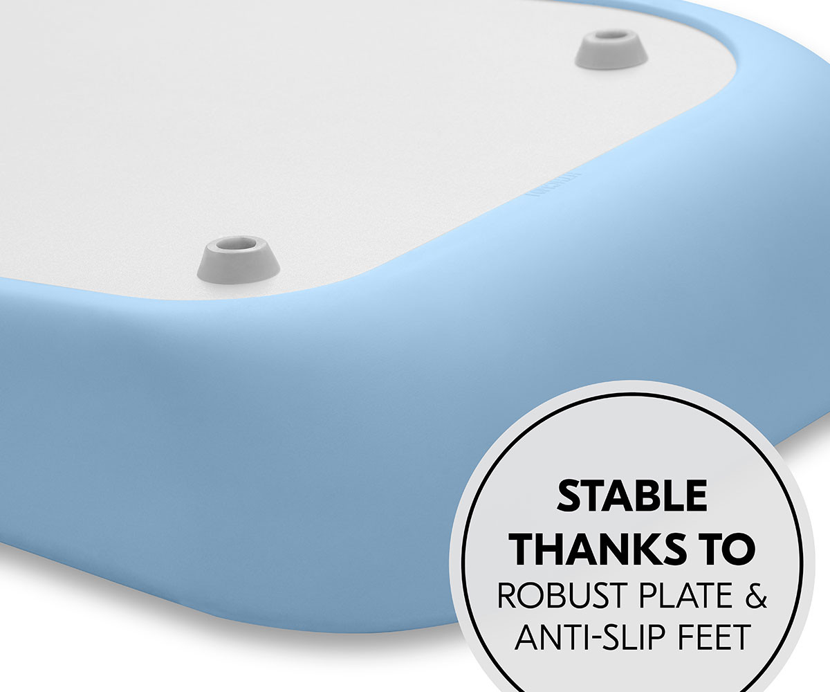 Пяната на подложката е мека, подкрепя естествената позиция на лежане и държи вашето бебе топло по време на смяна на пелените, дори когато пътувате. Подложката за преповиване е стабилна и сигурна. Гърбът, който е леко вдигнат от пода, се състои от здрава плоча с четири крачета, които създават допълнителна въздушна възглавница между подложката и пода. Закръглените ръбове предпазват главата на вашето бебе, а вдигнатите ръбове осигуряват допълнителна защита срещу търкаляне.