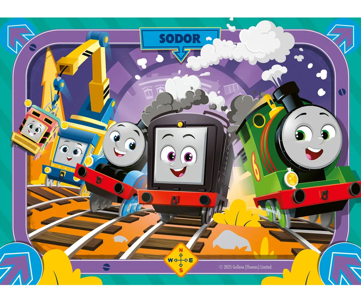 Пригответе се за много вълнуващи приключения, защото Томас е заедно със своите приятели и ги очакват нови предизвикателства! Присъединете се към Томас, Кана, Гордън, Харолд, Бруно, Ниа, Фарона, Дизел, Пърси, Санди и Карли, докато поемат по релсите към следващото предизвикателство. Страхотен подаръй за всеки фен на Thomas & Friends! Детски пъзели 4 в 1 в кутия са изработени от висококачествени материали и са с размер 19 x 14 см, когато са сглобени. Чудесни пъзели за деца на възраст 3+ години. Напълно отговарят на всички необходими стандарти за тестване и безопасност във Великобритания и ЕС.