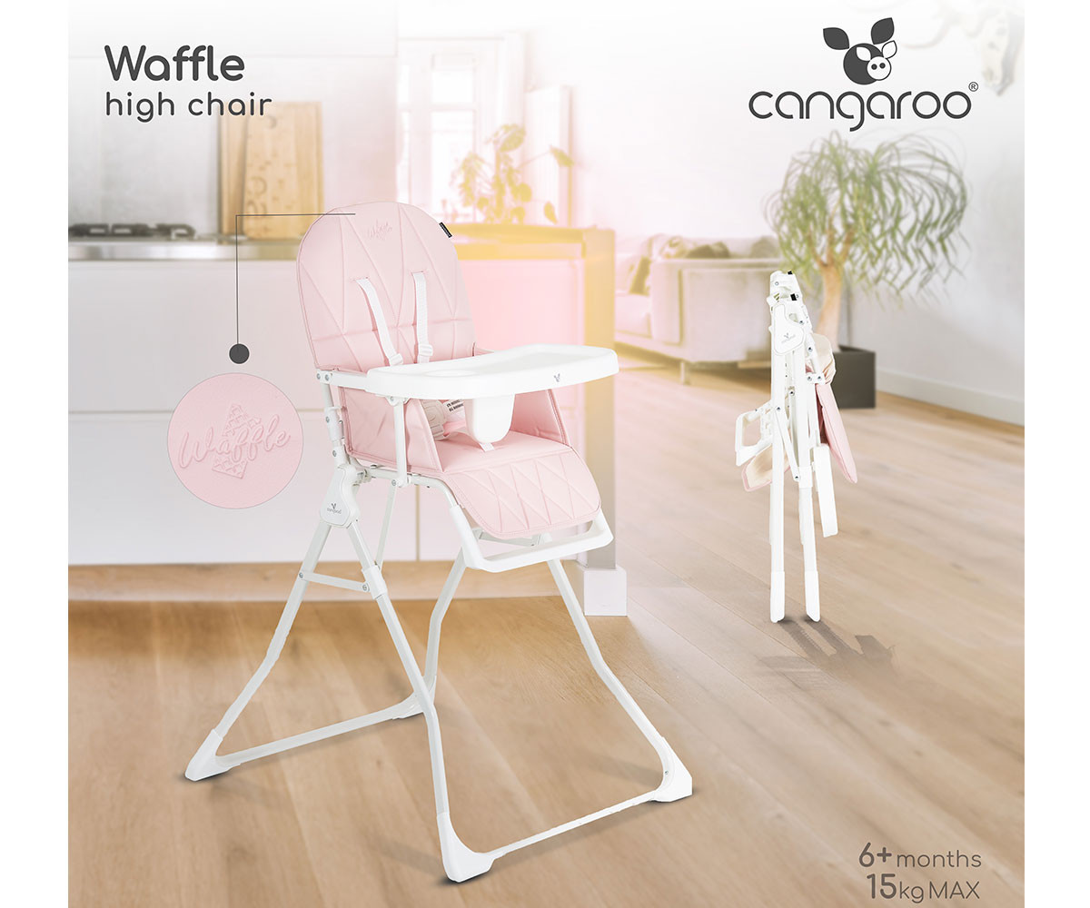 Изчистен и елегантен дизайн в модерни пастелни цветове, който се вписва с лекота във всеки интериор. Waffle на Cangaroo е ултра лек и компактен стол за хранене, създаден да улесни родителите в ежедневието – идеален за пренасяне и съхранение.