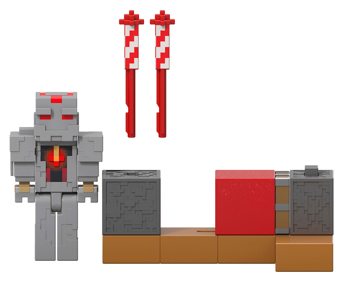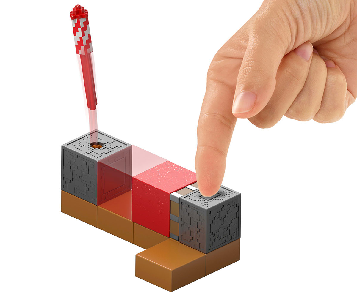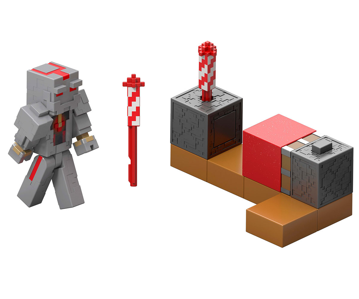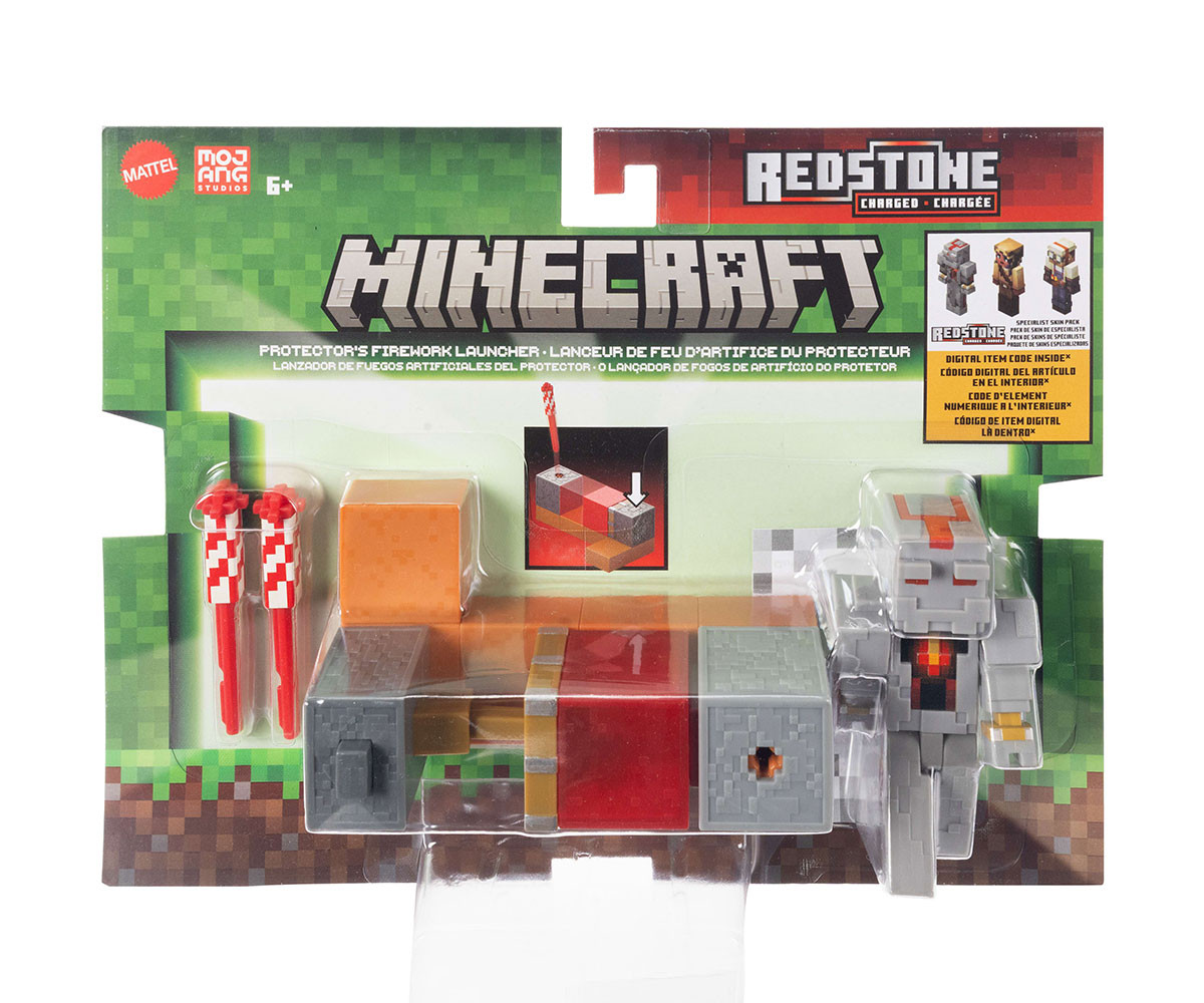 Светът на Minecraft се разширява със „силата на Redstone“ чрез серията Minecraft Redstone Charged екшън комплекти. Комплектът Protector's Firework Launcher включва подвижна фигурка Protector с височина около 8 см, специално устройство „Redstone Charged“ и аксесоари, които позволяват на феновете да изстрелват „фойерверки“ във въздуха. Комплектите са разработени от дизайнерите на Minecraft с динамичен механизъм за още по-забавно колекциониране. Всеки комплект включва и DLC код за достъп до ексклузивен предмет в играта. Продават се поотделно и са в зависимост от наличността. Цветовете и декорациите може да варират.