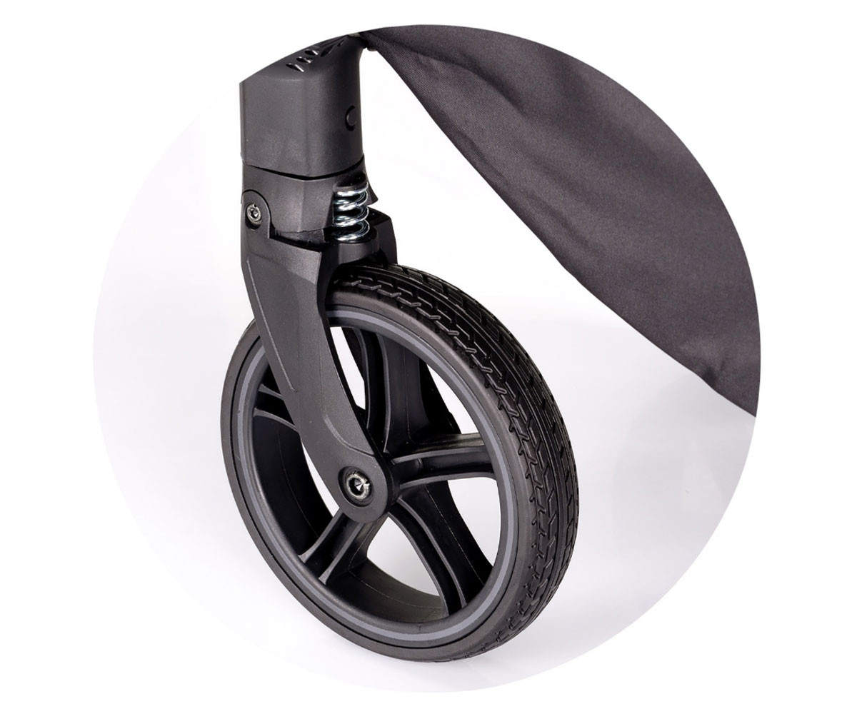 - Всички колела са с амортисьори и се свалят с едно движение;