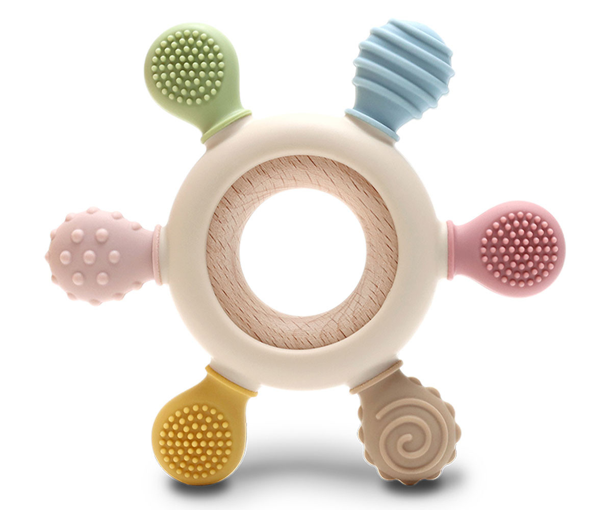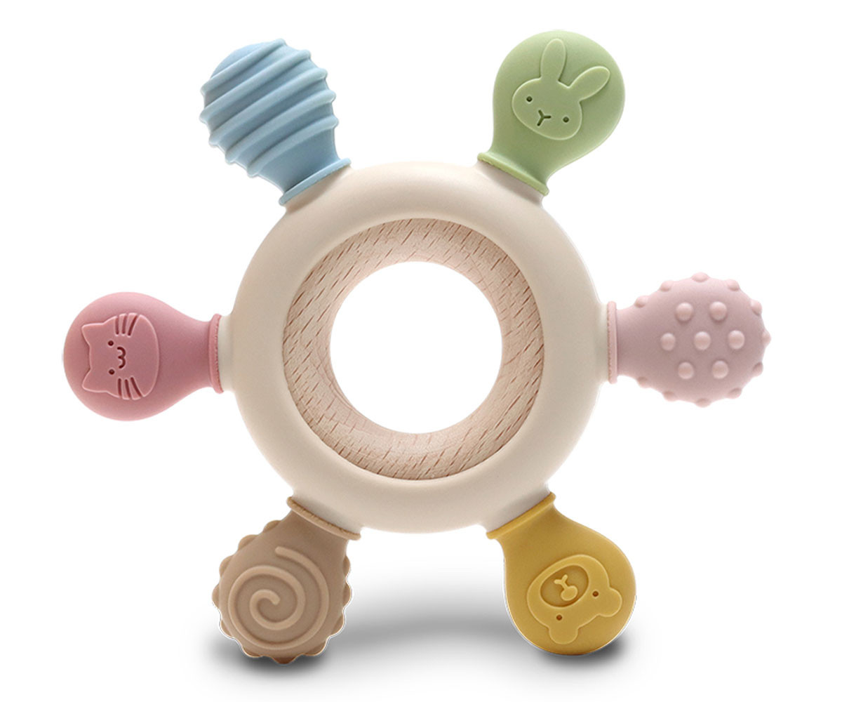 Изработена от силикон и букова дървесина. Перфектна за масажиране на нежните венци на бебето в периодa на растеж на млечните зъбки. Леснa за хващане.