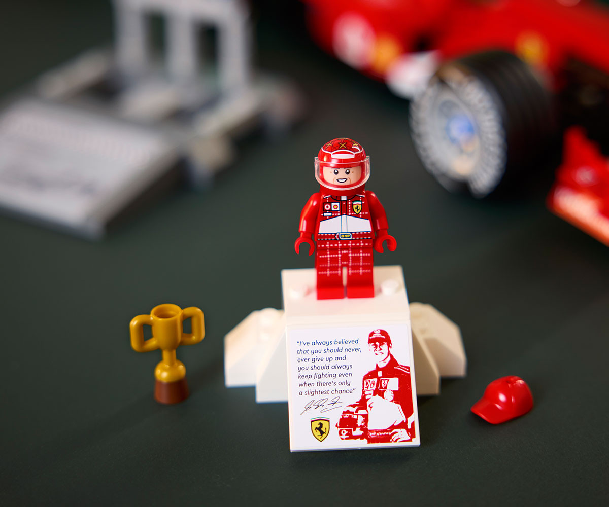 - ДЕТАЙЛИ ЗА ПОКАЗВАНЕ НА НАГРАДИ - включва стойка за състезателния автомобил от Формула 1 с отпечатани статистически данни за автомобила и подиум за минифигурата на пилота с отпечатано изображение и цитат на Michael Schumacher;