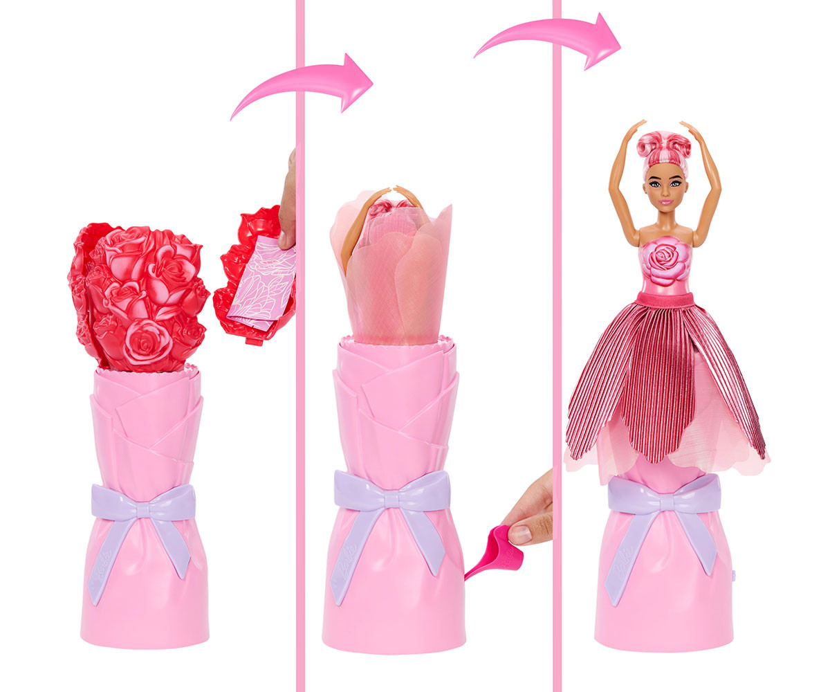 - Цветното разопаковане започва с букет! Стъпка 1: откъснете листенцата, за да откриете лейката. Стъпка 2: добавете вода и я излейте в отвора отстрани на вазата. Стъпка 3: наблюдавайте как Barbie се появява! Поставете куклата обратно и натиснете бутона, за да повторите ефекта отново и отново;