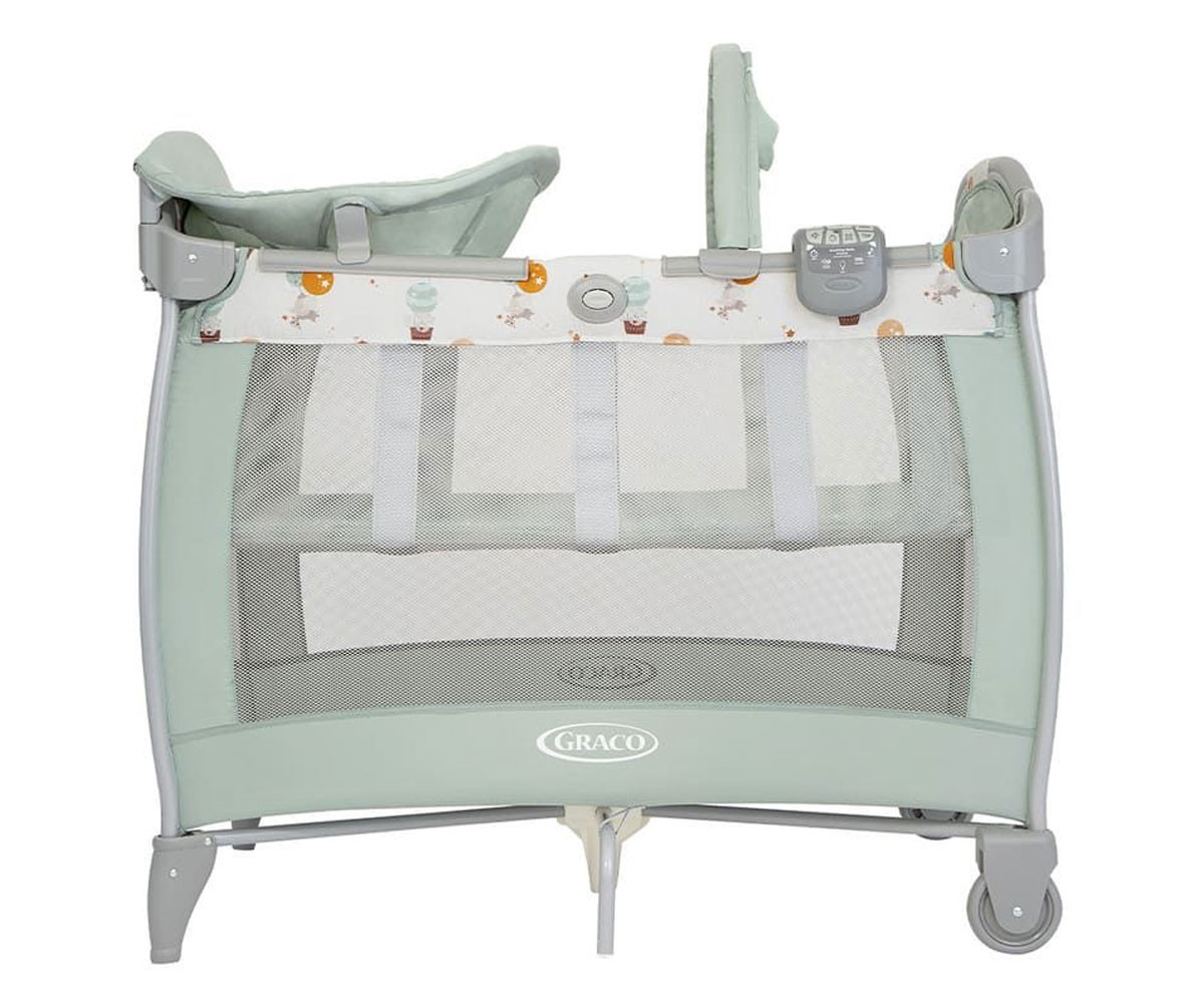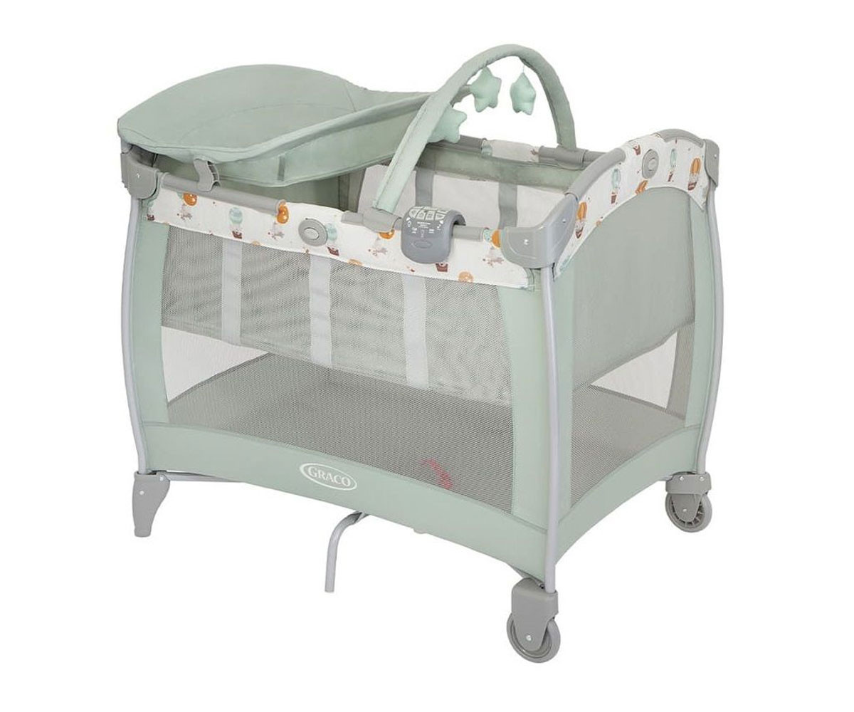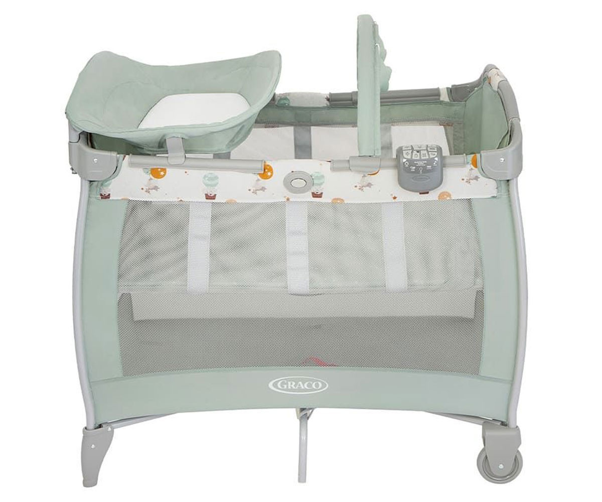 Запознайте се с кошарата за пътуване на Graco с най-много функции! Още от първите си дни с бебето се възползвайте от удобната Contour Electra, за да осигурите комфорт и уютно място за сън. Просторната кошара се предлага с интегриран повивалник, гриф с играчки и сваляща се контролна кутия, която ви позволява да контролирате музиката, вибрацията и нощната светлина. Готови ли сте да вземете тази кошара със себе си? Пренасяйте я лесно от стая в стая с помощта на 2-те колела. Сгънете я с едно лесно движение, като използвате характерното сгъване с бутон на Graco. След това използвайте включената удобна чанта за носене, за да направите пътуването лесно. Второ ниво за малки бебета, което се сваля, когато детето започне да се повдига самo на ръце и да сяда (около 6 месеца; максимално натоварване на второто ниво: 9 кг). Второто ниво ще ви осигури повече удобство при поставяне и взимане на бебето, без излишно да натоварва гърба ви.