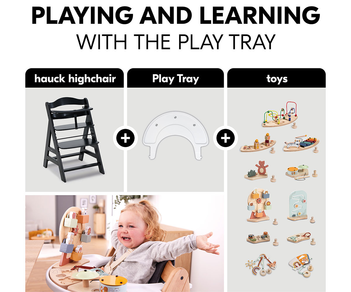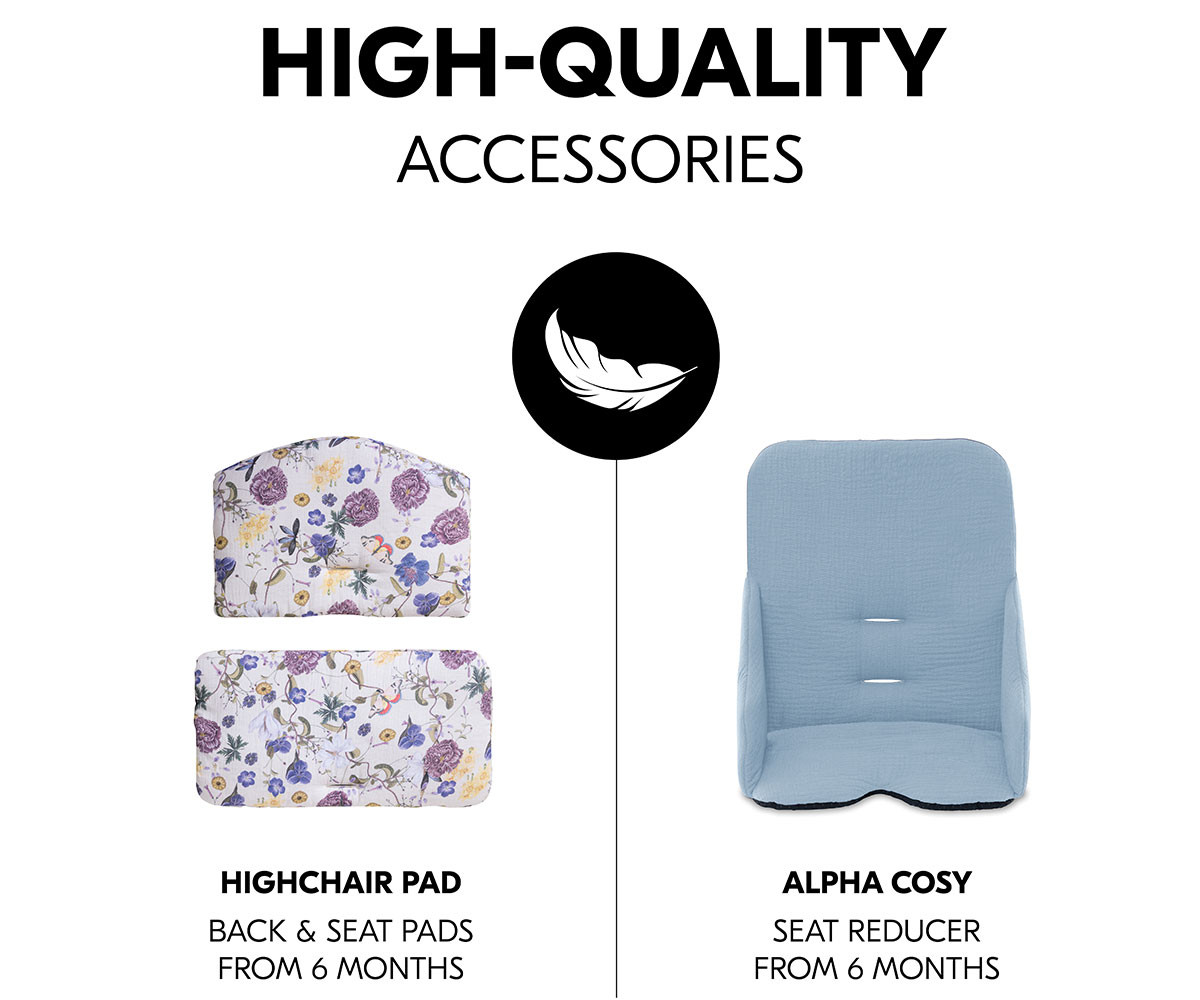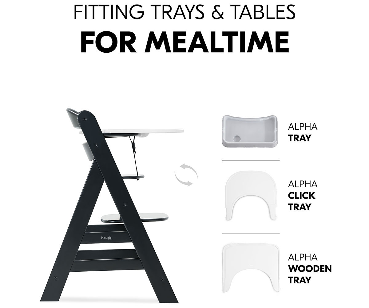Alpha+ може да се комбинира с таблата Alpha Tray, което позволява използване като самостоятелно столче от 6-месечна възраст.