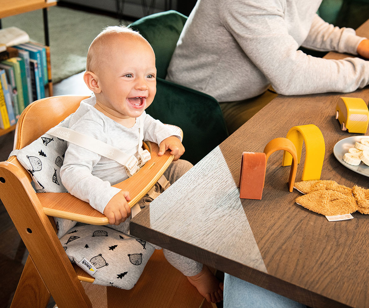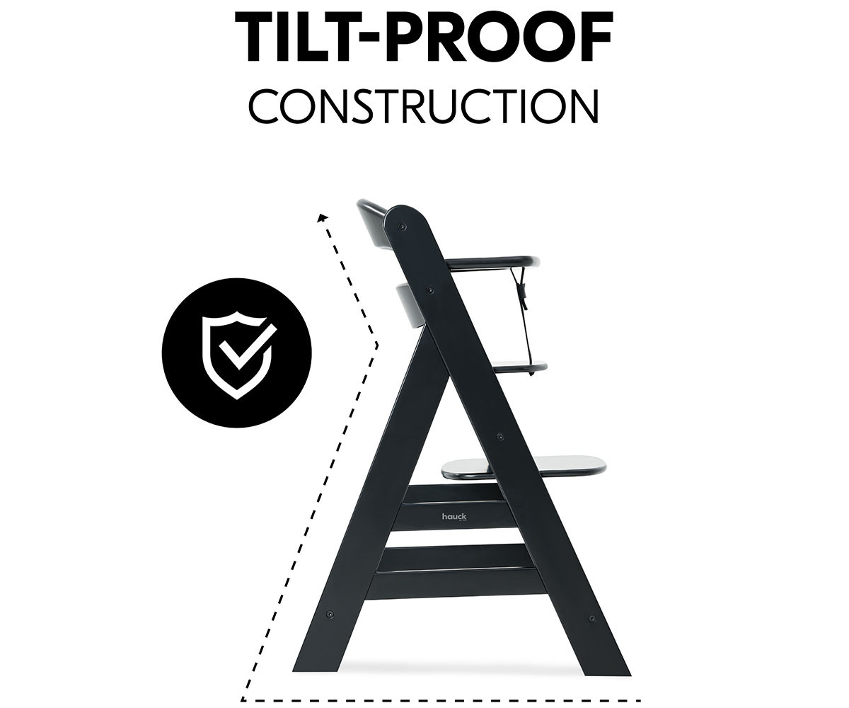 Стабилната конструкция и вградените плъзгачи за под осигуряват защита срещу преобръщане. Ако детето се отблъсне от масата, столчето леко се приплъзва назад, вместо да се накланя.