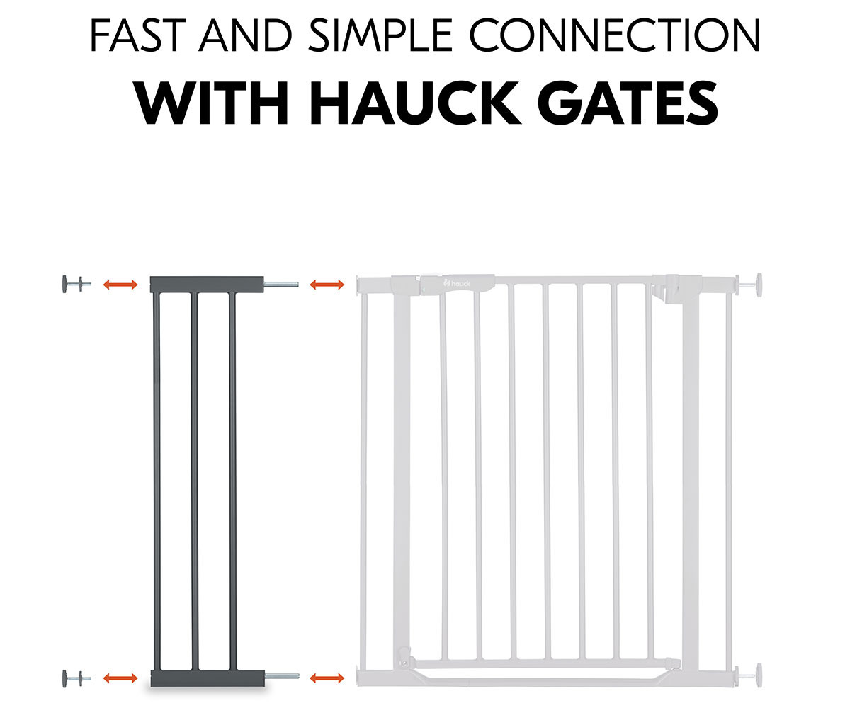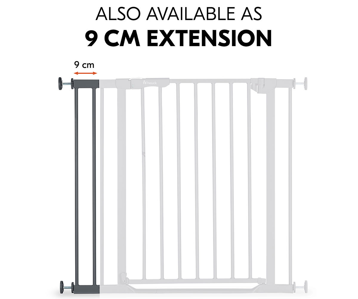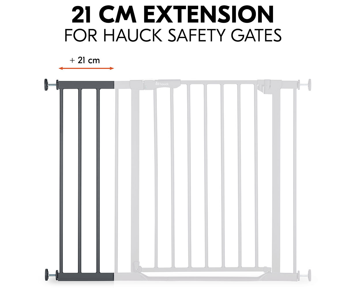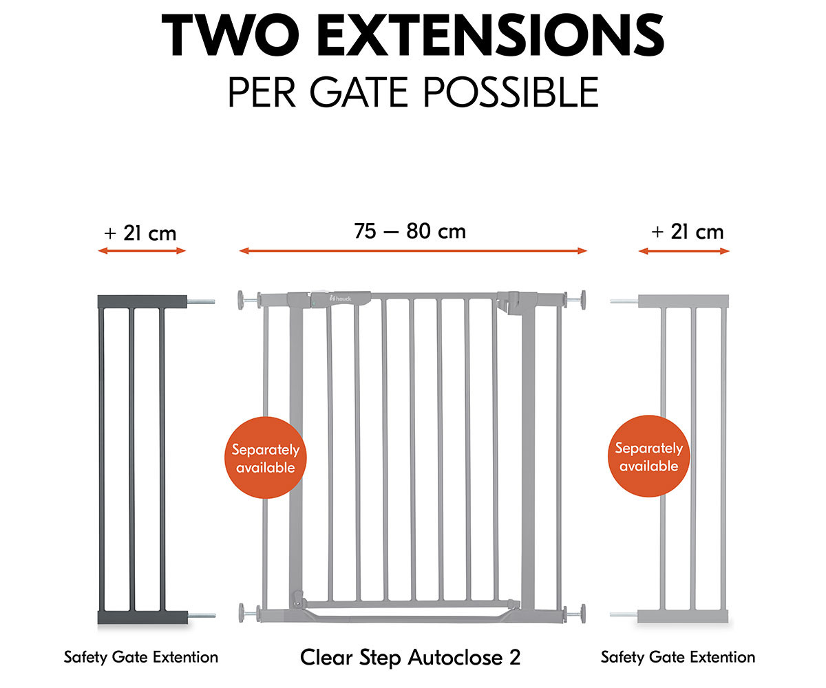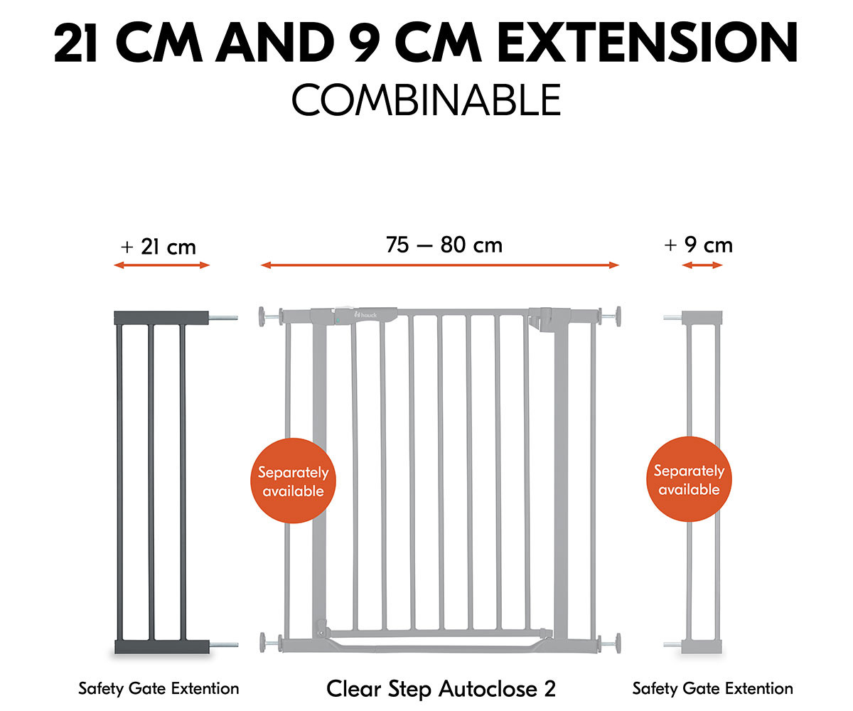 С удълженията Hauck можете гъвкаво да регулирате своята преграда за безопасност с основна ширина от 75-80 см. Всяка страна на преградата може да бъде оборудвана с максимум едно удължение – 9 см или 21 см.