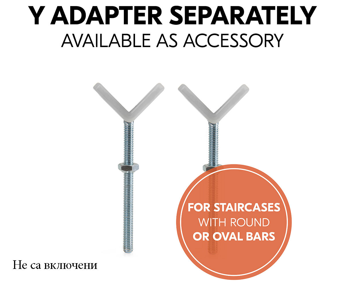 Допълнително, с отделно закупуваните Hauck Y-аксесоари, можете да прикрепите удължението и преградата за безопасност към стълбове с кръгли или овални парапети – всичко това без пробиване!