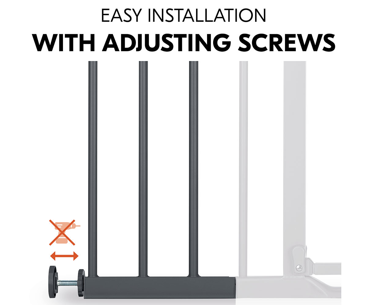Инсталацията е много лесна: свържете удължението с вашата преграда за безопасност, използвайки включените конектори. След това прикрепете регулиращите винтове към външните страни на удължението. Накрая закрепете преградата и удължението, като ги притиснете здраво в рамката на вратата или стълбището – бързо, стабилно и сигурно.