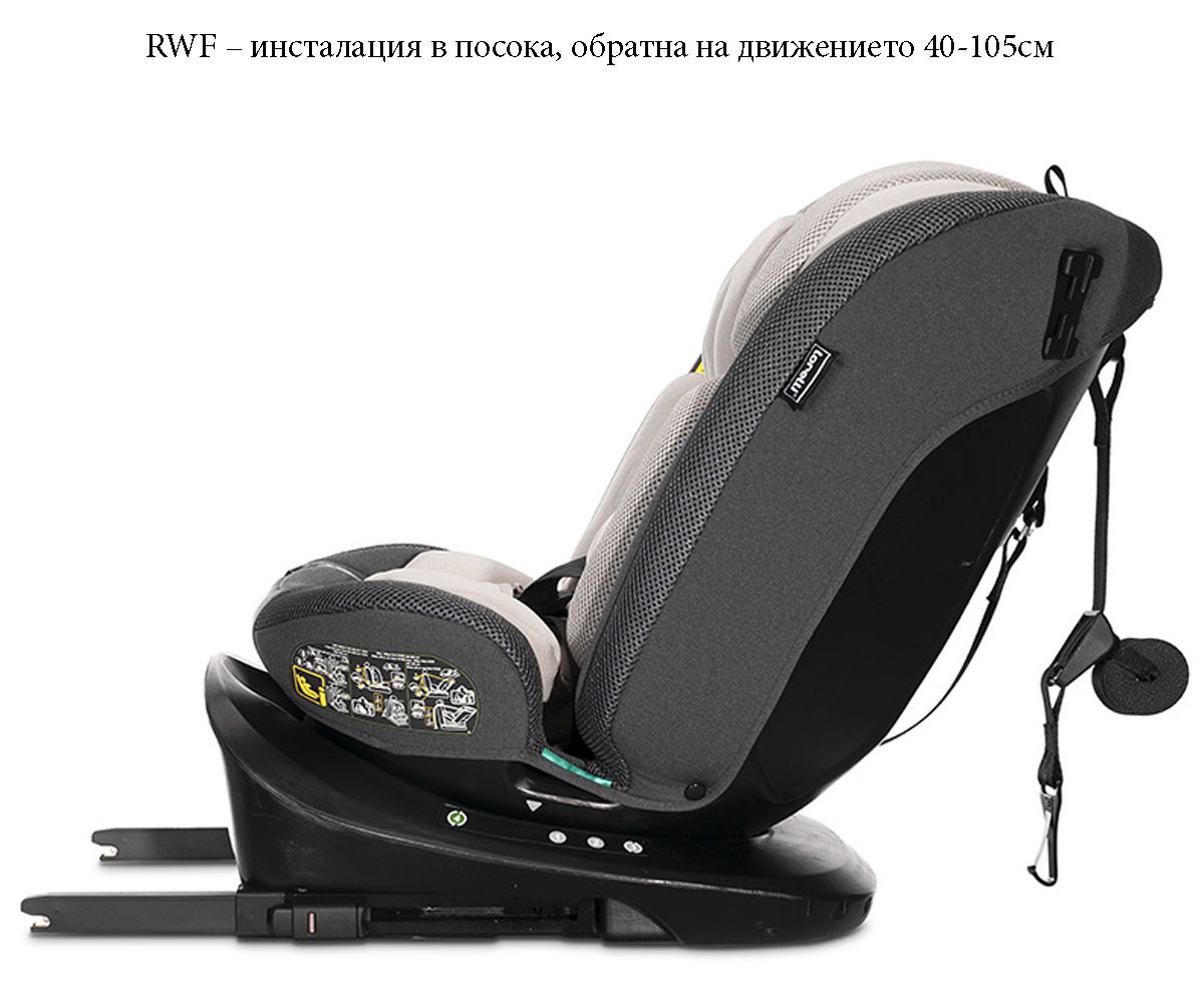 - Лесен монтаж чрез ISOFIX и горен колан за ръст 40-105 см и с обезопасителен колан за възрастни със или без ISOFIX закрепване за ръст 100-150 см;