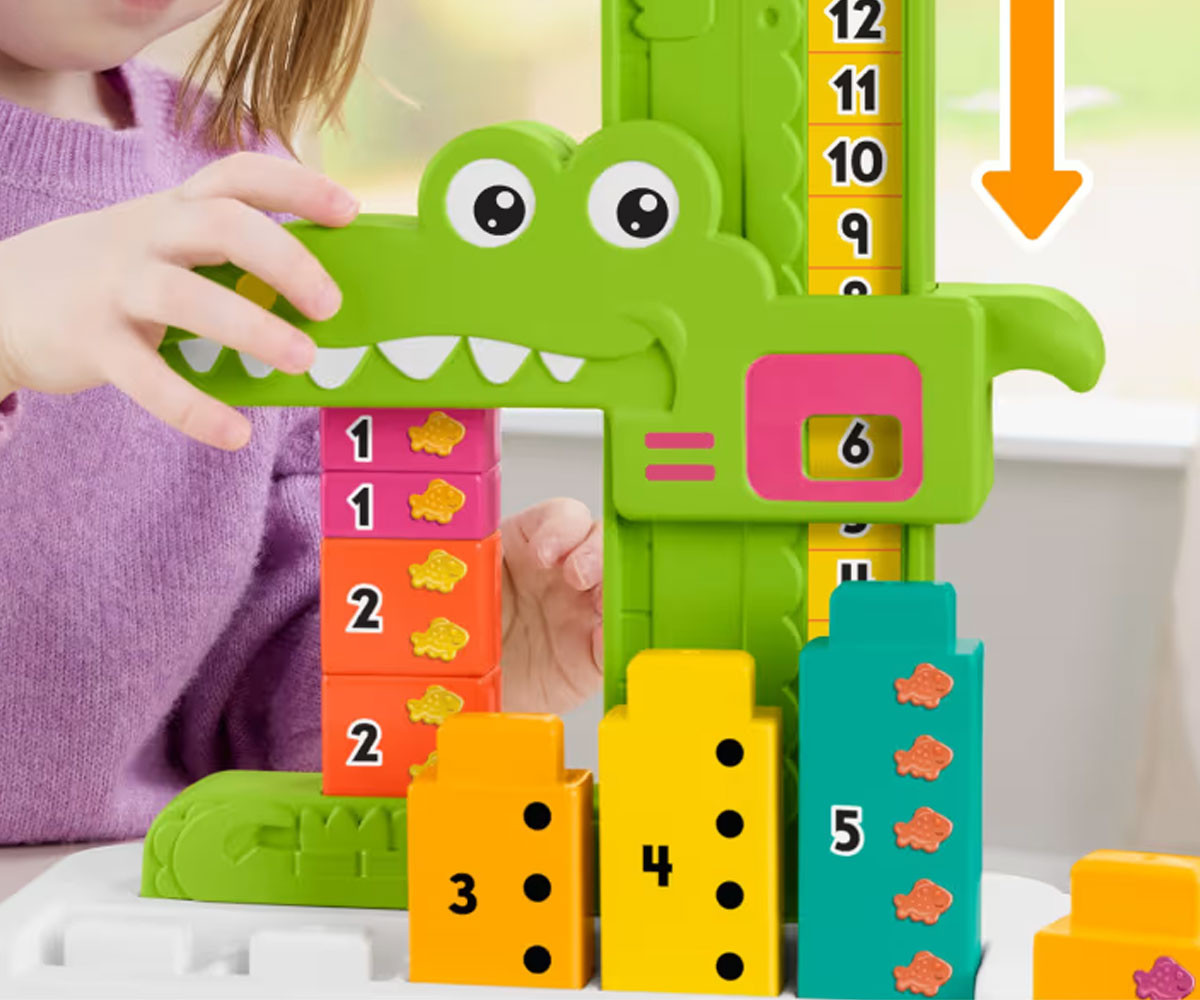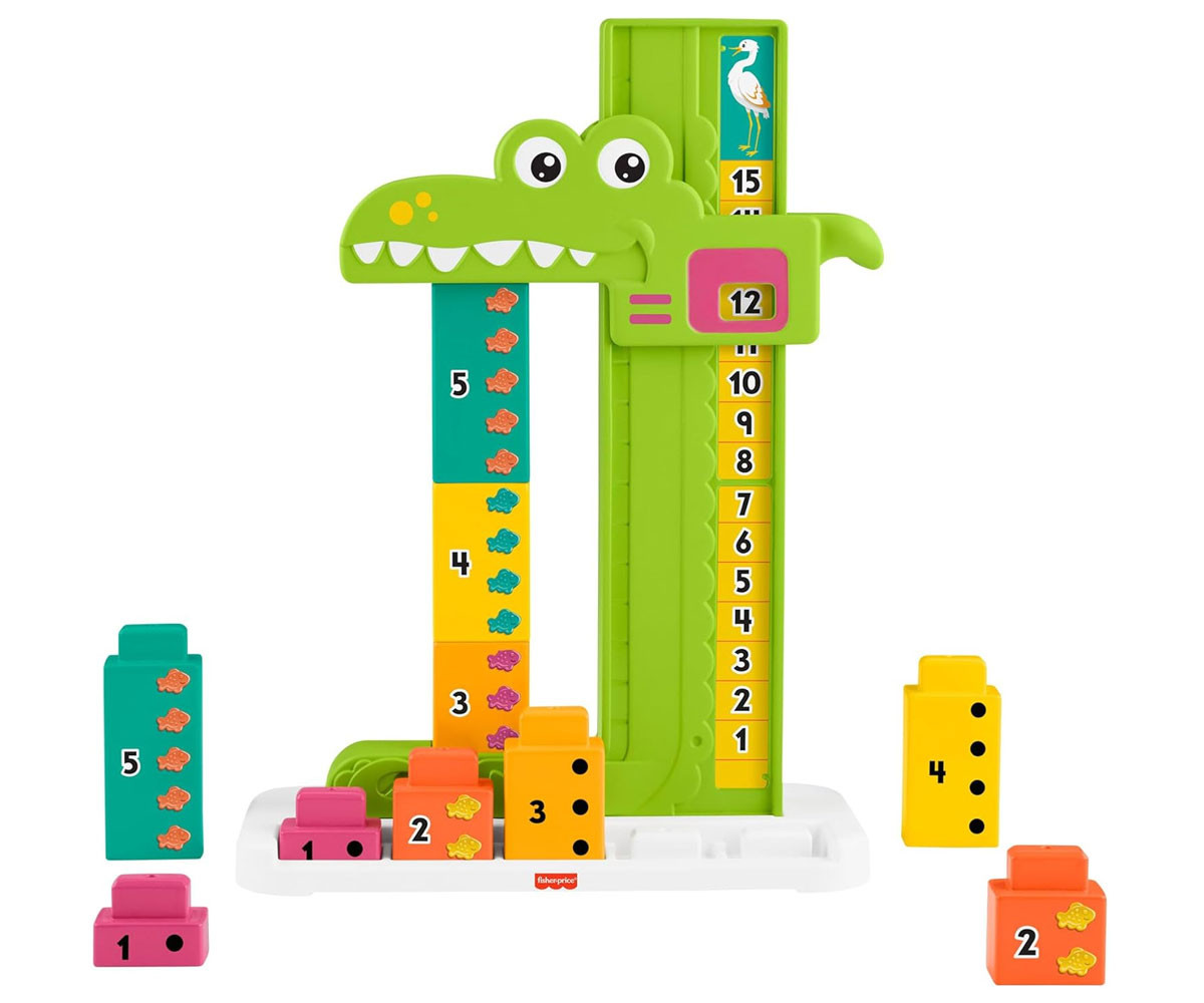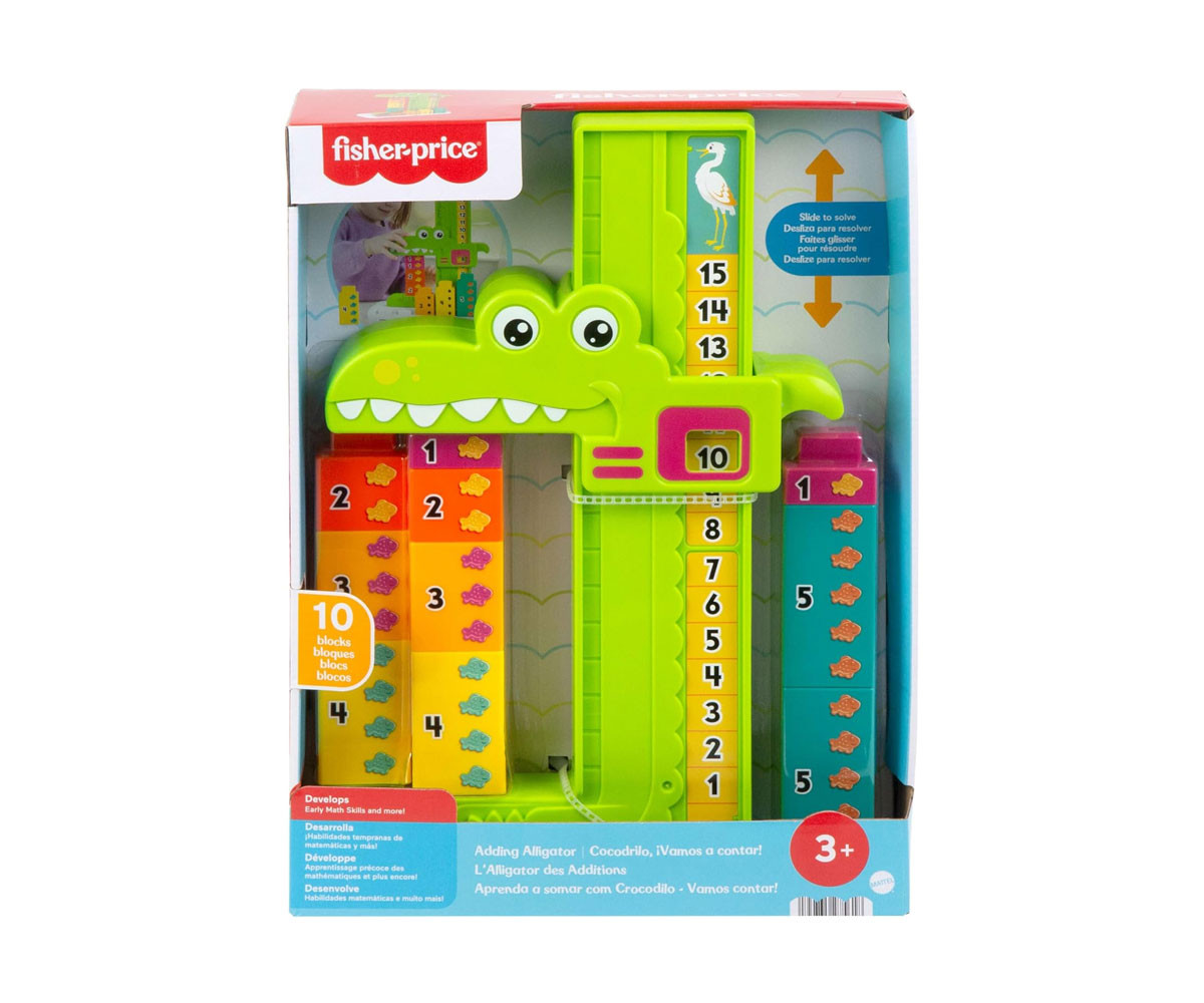 Детските играчки за учене от Fisher-Price, като играчка за събиране алигатор, предоставят забавление за малчуганите, докато се запознават с числата и основни математически концепции чрез блокчета и игра. Децата могат да се запознаят с добавянето и изваждането, благодарение на номерираните блокчета, за да "нахранят" алигатора. Когато преместят главата на алигатора, тя спира на горния блок и показва правилната сума на числата! Децата могат да опитат различни комбинации от числа или да премахват блокчета, за да видят как работи изваждането. Цветовете и декорациите може да варират.