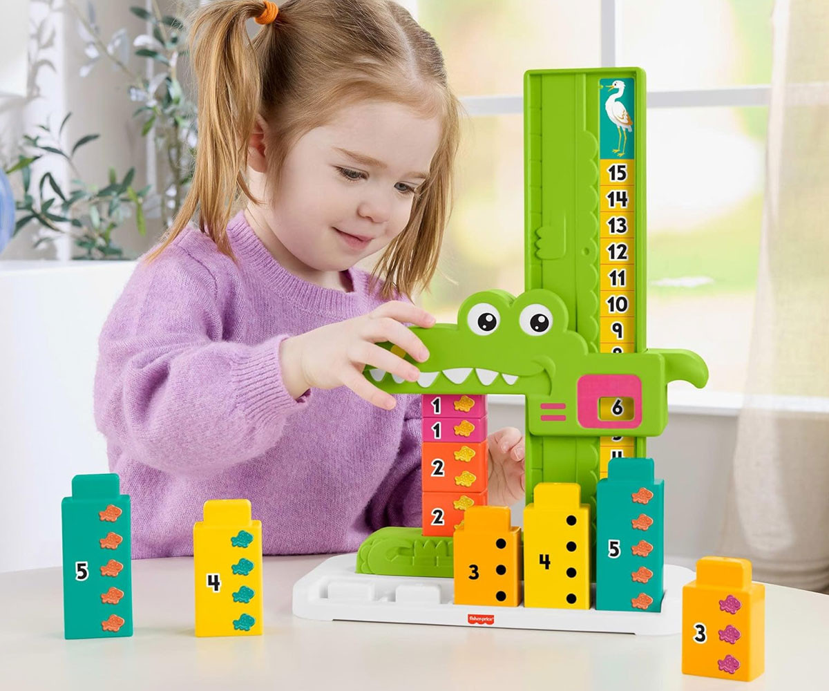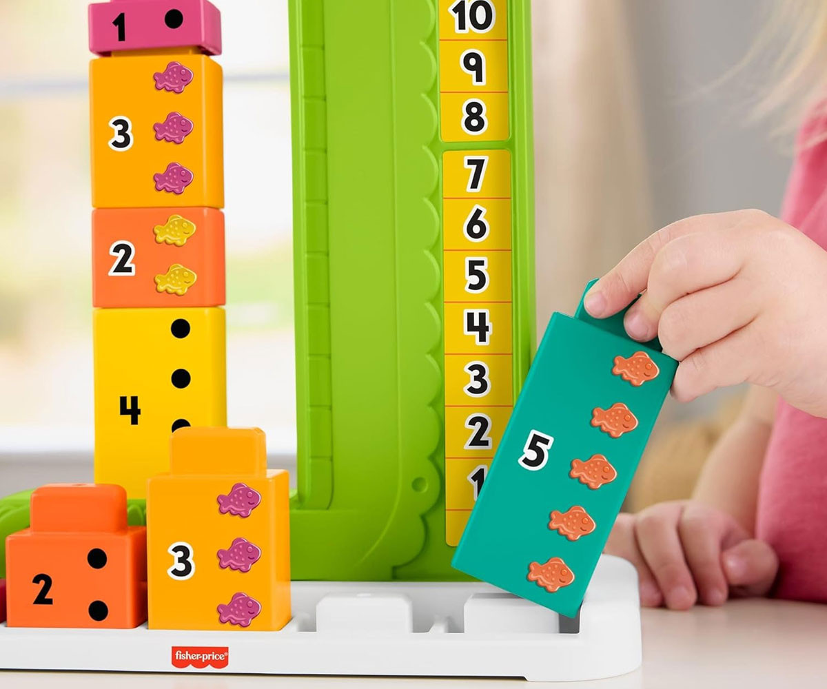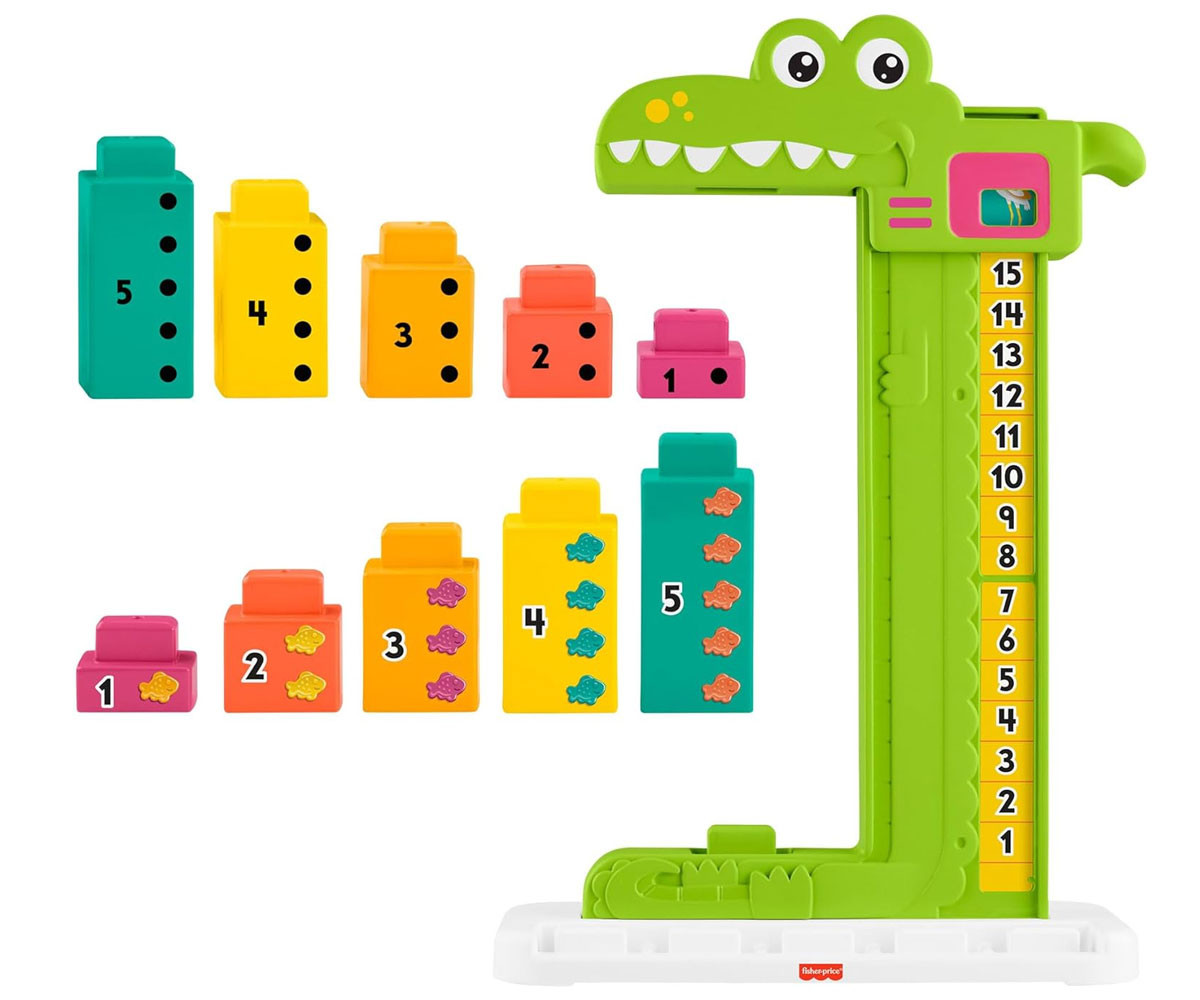 Детските играчки за учене от Fisher-Price, като играчка за събиране алигатор, предоставят забавление за малчуганите, докато се запознават с числата и основни математически концепции чрез блокчета и игра. Децата могат да се запознаят с добавянето и изваждането, благодарение на номерираните блокчета, за да "нахранят" алигатора. Когато преместят главата на алигатора, тя спира на горния блок и показва правилната сума на числата! Децата могат да опитат различни комбинации от числа или да премахват блокчета, за да видят как работи изваждането. Цветовете и декорациите може да варират.