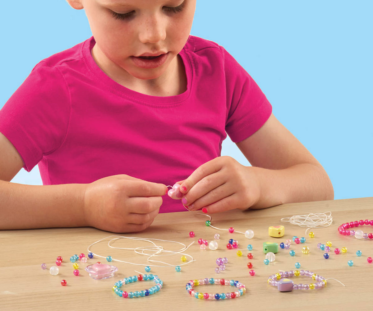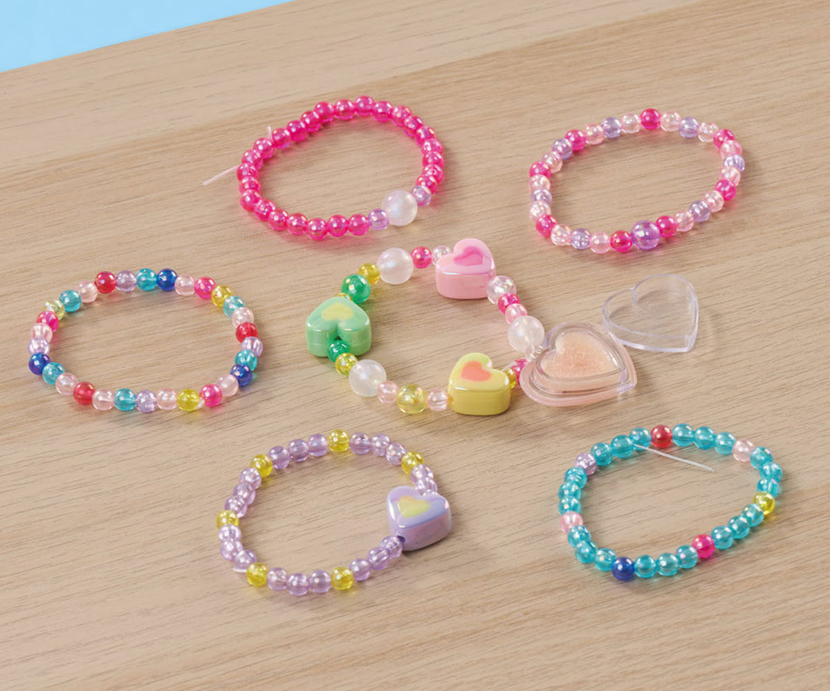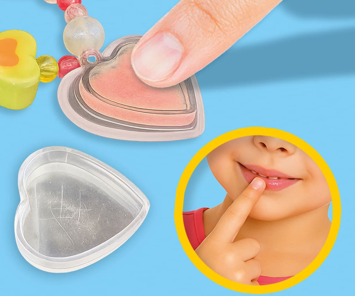 С комплекта гривна с гланц за устни децата могат да създават свои собствени бижута с весели мъниста във формата на сърца. Комплектът включва специален медальон сърце, пълен с истински блестящ гланц за устни, който придава допълнителен блясък и стил на всяко творение.