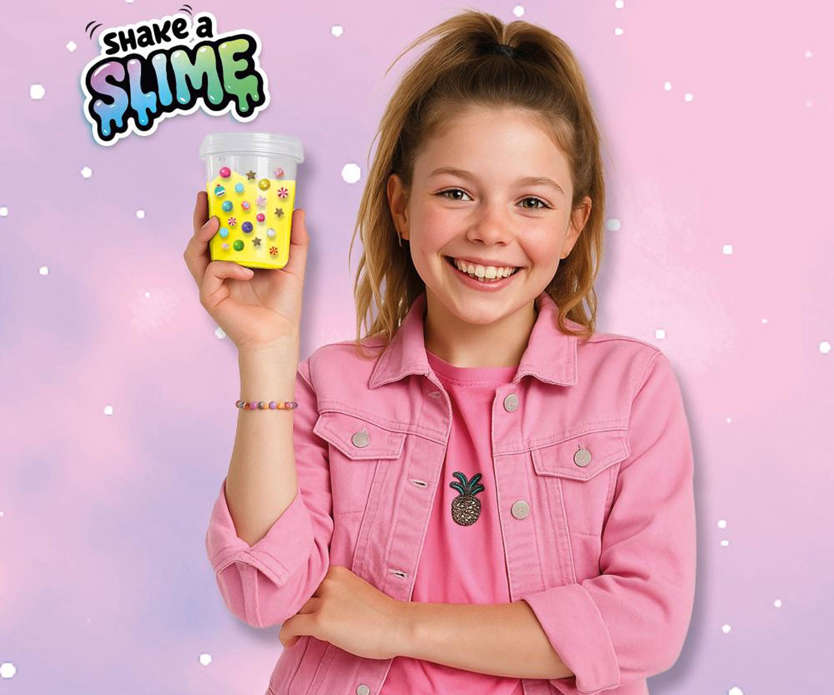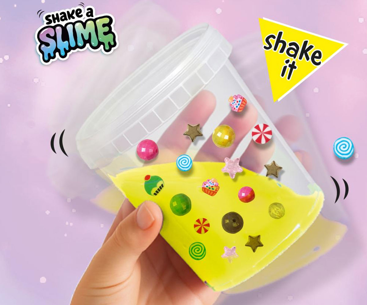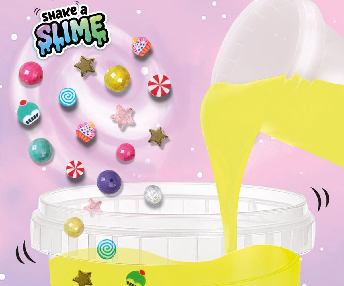 Със специалната шейкър чаша мънистата се смесват лесно и ефектно. Добавете готовия слайм и декорациите, разклатете и създайте своя уникален „бонбонен слайм“. С този комплект можете да създадете най-сладките и забавни комбинации!