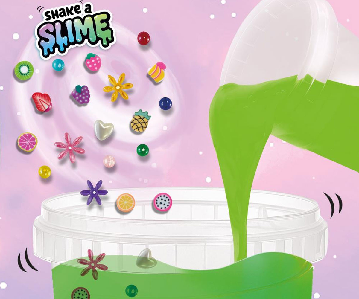 Със специалната шейкър чаша мънистата се смесват лесно и ефектно. Добавете готовия слайм и декорациите, разклатете и създайте своя уникален „слайм плодове“. С този комплект всяка игра се превръща в истинско плодово забавление!