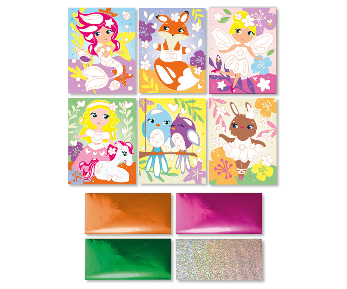С този блестящ творчески комплект децата могат сами да създават красиви приказни герои. Чрез пренасяне на фолио върху лепящите се картички се получават цветни и искрящи произведения, с които те могат да се гордеят.