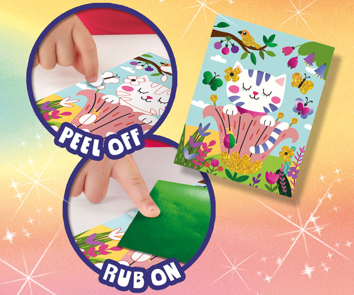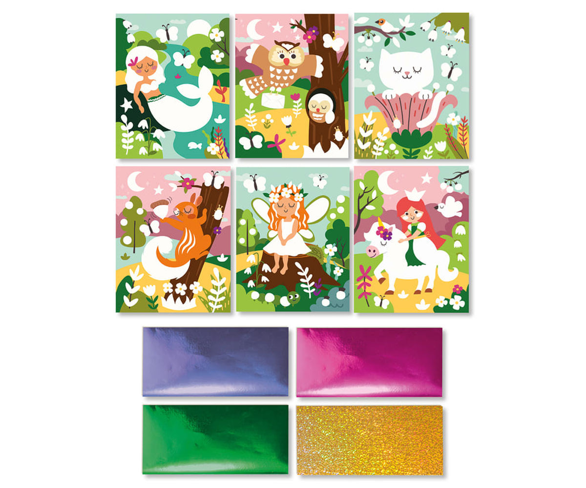 С този блестящ творчески комплект децата могат да създават вълшебни горски герои. Като отлепят части от картичките, поставят фолио и внимателно го разтрият с пръст, се появяват красиви и сияйни картини.