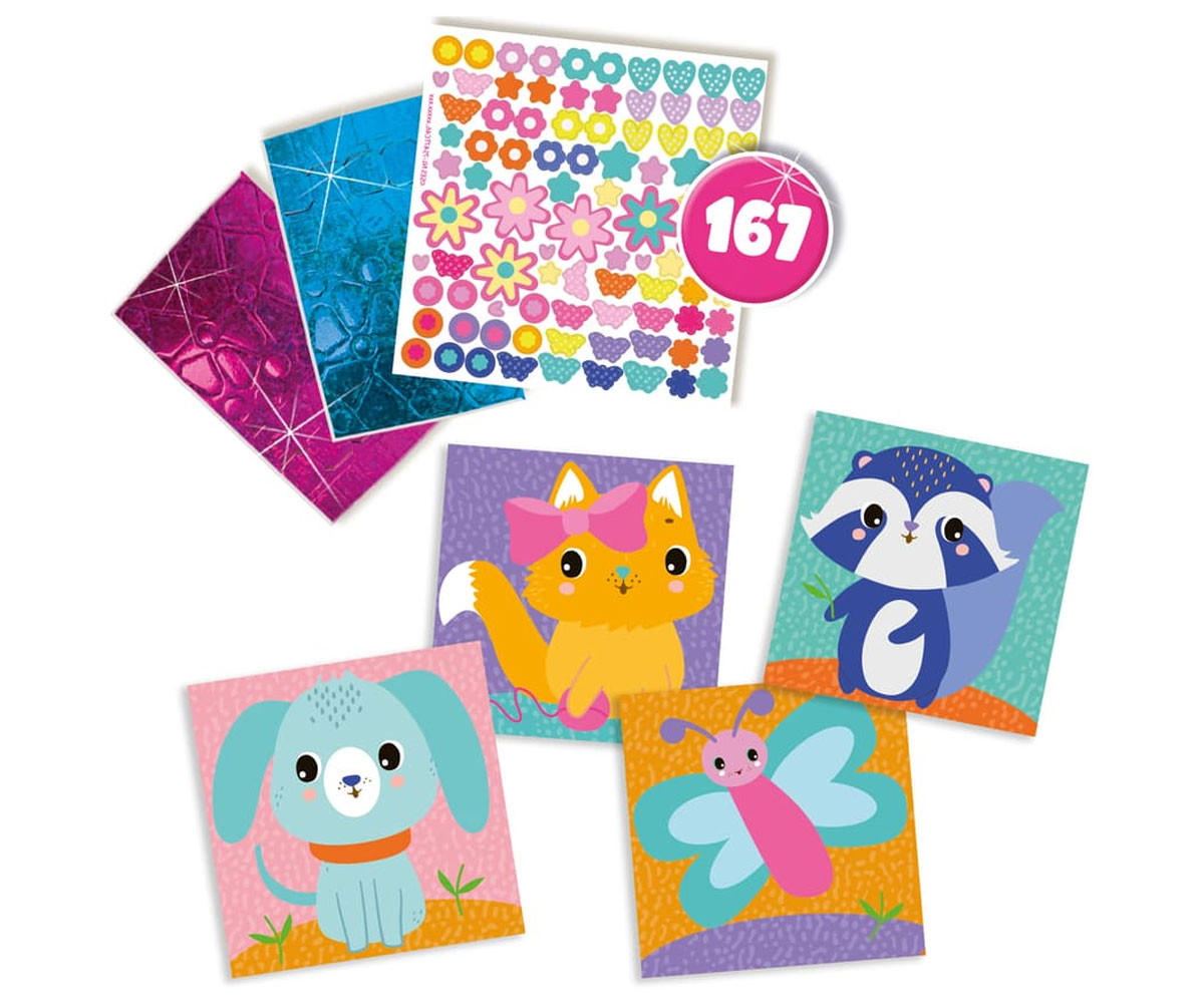 С този весел комплект децата (3+) могат да създават свои собствени артистични картини с животни! Залепете множеството цветни и блестящи стикери върху картите и създайте уникални колажи, изпълнени с цвят и настроение.