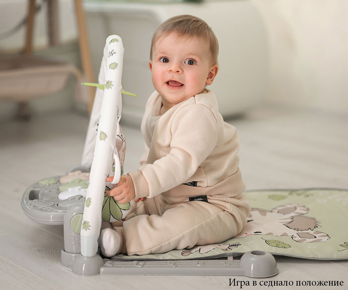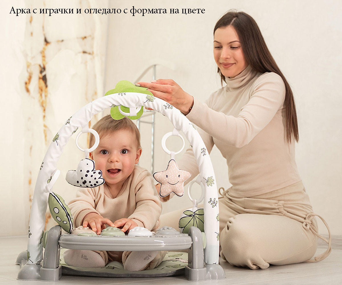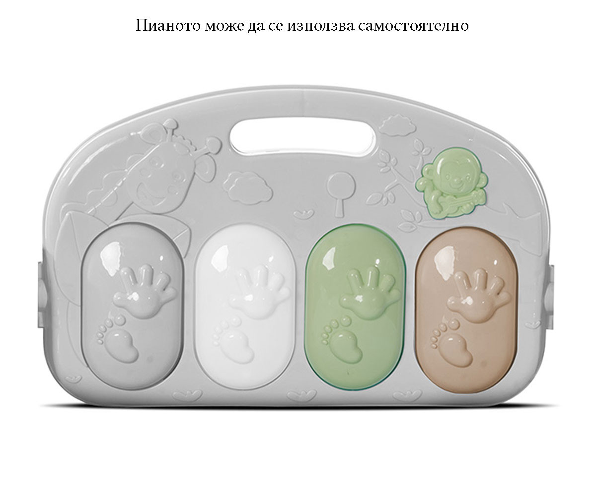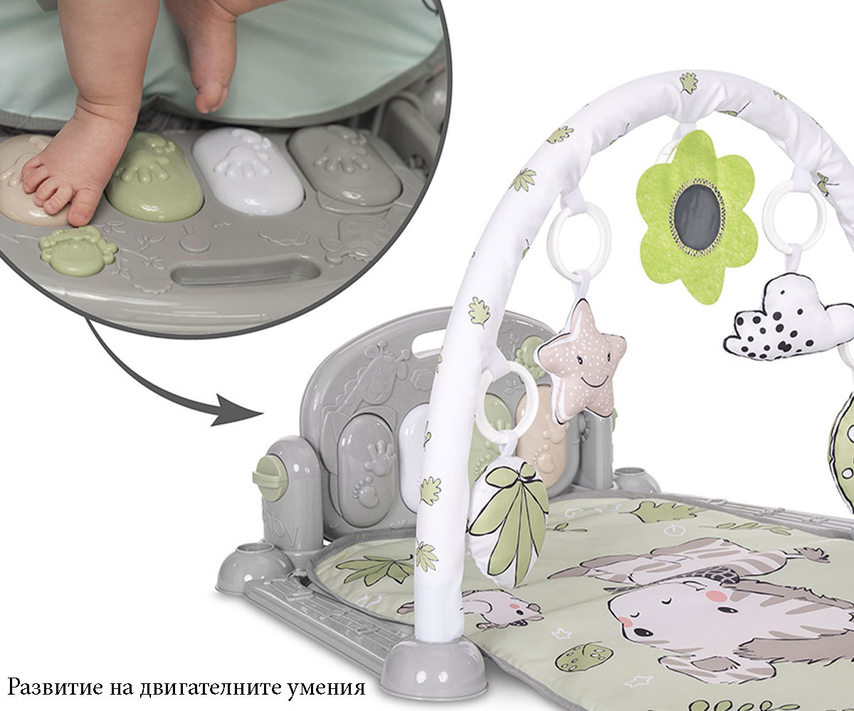 - Лежане и игра - Закачените играчки на арката првличат вниманието на бебето. Бебето развива зрението и движението си. Ритането по пианото произвежда музика, Това го насърчава да играе и да практикура движенията на краката;