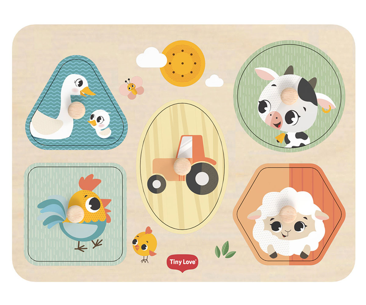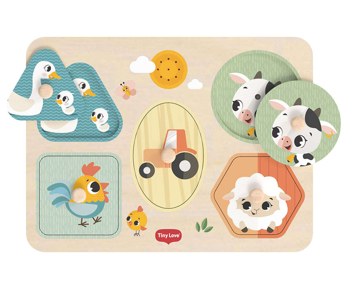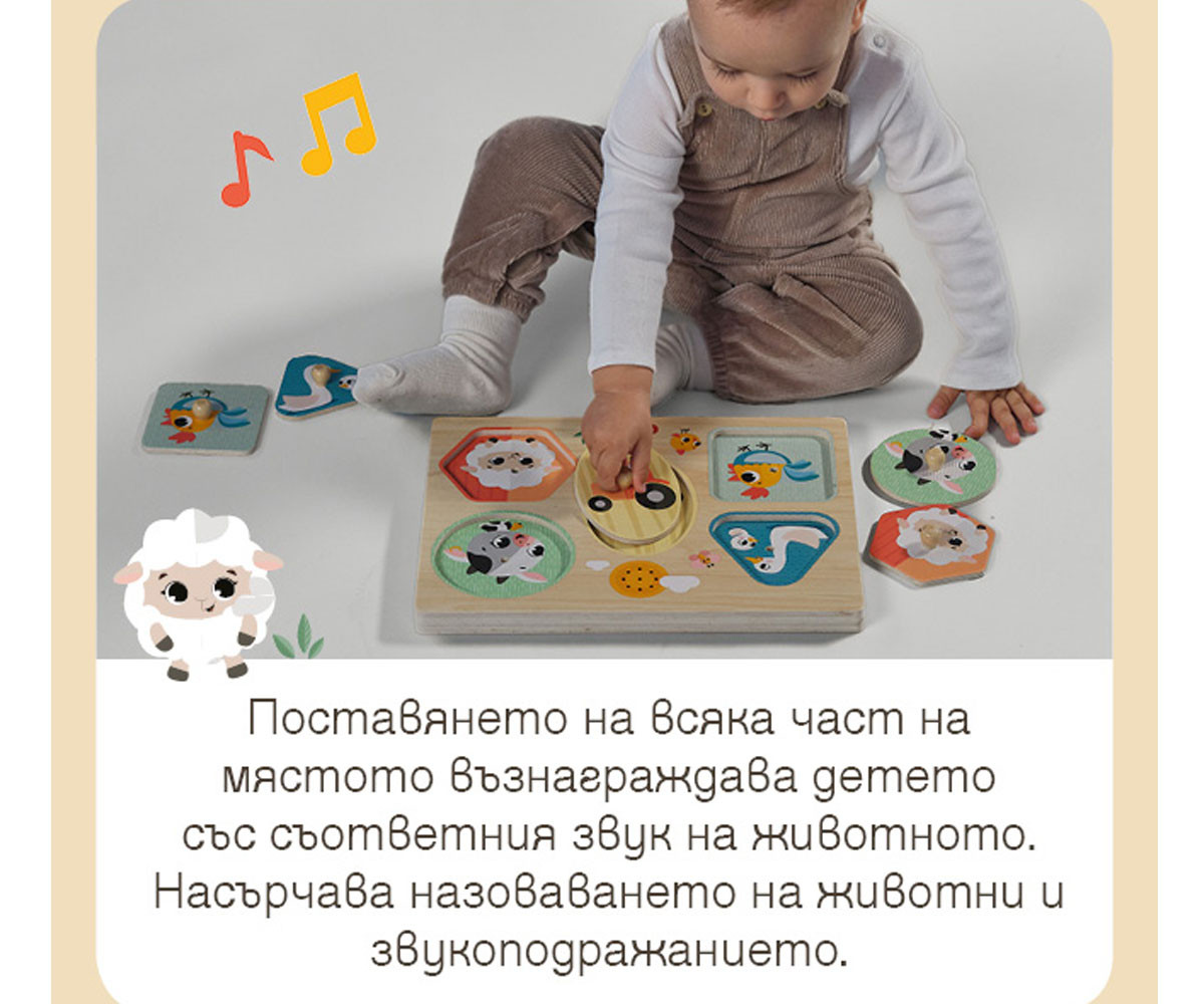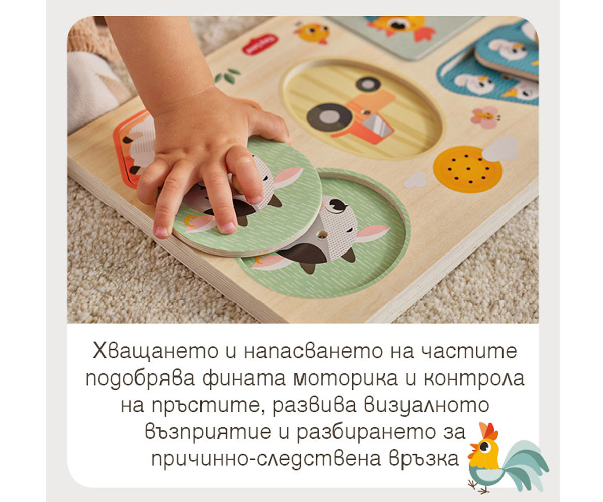 Музикалният дървен пъзел Tiny Love Farmers Funday My First Sound Puzzle въвежда детето в света на цветовете, формите и звуците, като превръща ученето в увлекателно преживяване. Това е Монтесори вдъхновена играчка, която съчетава логика, движение и сетивна стимулация чрез игра. Пъзелите са сред най-ценните играчки в ранното развитие, защото едновременно развиват мисленето, фината моторика и концентрацията. Този модел надгражда класическия дървен пъзел, като добавя звуков ефект - при правилно поставяне на всяко парче се чува реалният звук на съответното животно. Така всяко действие на детето получава незабавна обратна връзка и се превръща в малко откритие. Играчката е създадена за деца над 12 месеца и включва 5 големи елемента с животни от фермата, всеки с удобна дръжка за лесно хващане. Формите са достатъчно различни, за да предизвикват детето да разпознава и съпоставя, а размерът им гарантира безопасност. Когато детето постави правилно фигурката - например кравата или прасенцето - то чува съответния звук. Това подпомага разбирането на причинно-следствените връзки и стимулира повторението чрез игра. Пъзелът е компактен (30 x 22.5 x 2 см), удобен за използване у дома или при пътуване, и е изработен от качествено дърво за дълготрайност и безопасност.