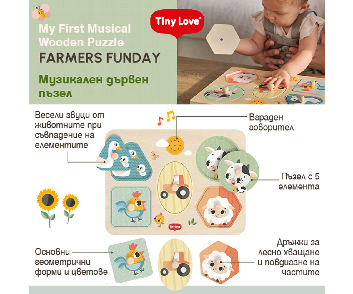 - Име: Tiny Love - Музикален дървен пъзел Farmers Funday, 12м+