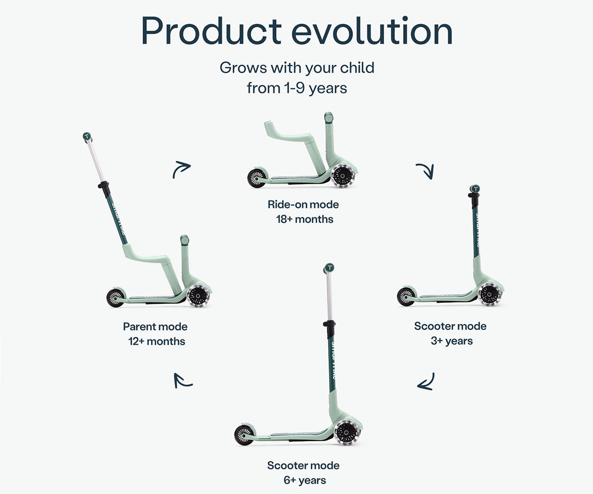 - Многостепенен дизайн: ride-on за малки деца → тротинетка за по-големи;