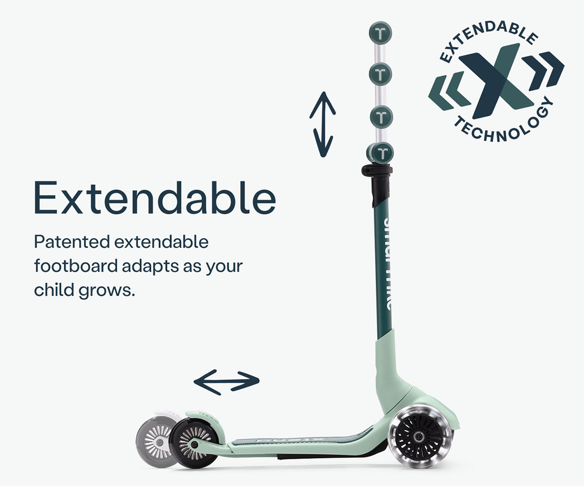 Xtend Mini-ride е единствената тротинетка, която расте заедно с детето ви – от първите стъпки на 12 месеца до самоуверено каране на 9 години. В ранните години удължаващата се платформа осигурява стабилност и помага на децата да развият баланс и координация. С израстването, тротинетката се трансформира и насърчава независимост и активна игра. LED колелата правят всяко каране по-вълнуващо и безопасно. А когато дойде време за прибиране – сгъването става с едно натискане. Създадена за активни семейства, Xtend Mini-ride съчетава безопасност, удобство и години забавление в един продукт.