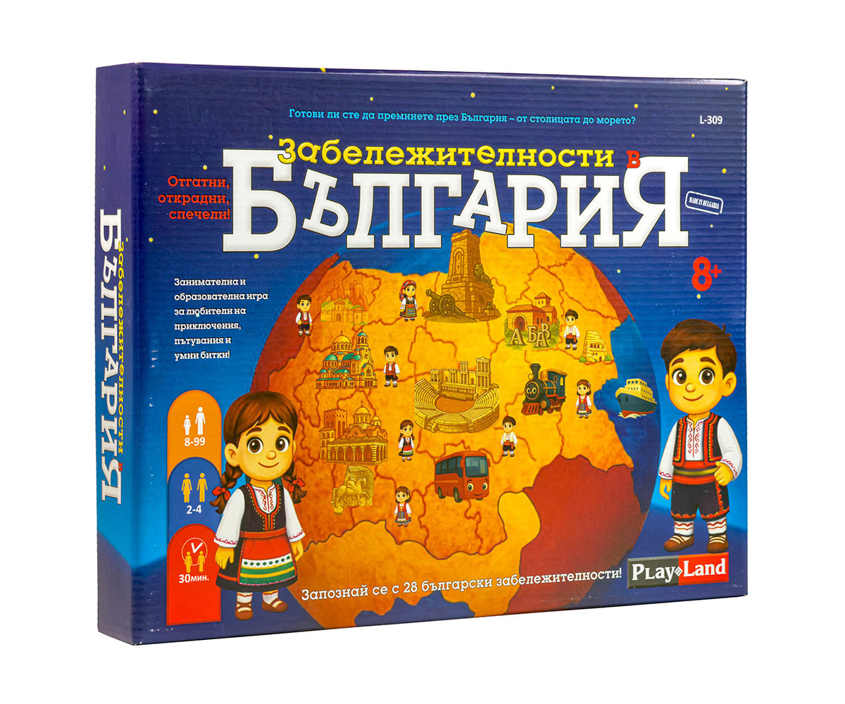 Готови ли сте да преминете през България - от столицата до морето? По пътя си ще срещнете различни забележителности, предизвикателства и въпроси. Ще имате възможността да покажете знания и артистичност, като ще се забавлявате през цялото време. „Забележителности в България“ е занимателна и образователна игра за любители на приключения, пътувания и умни битки! Целта е в края на играта да имаш най-много спечелени карти с предизвикателства/въпроси и най-много откраднати карти със забележителности. Играта е предназначена за деца над 8 години и възрастни, като в нея могат да участват 2-4 играчи. Продължителност: 30 минути.