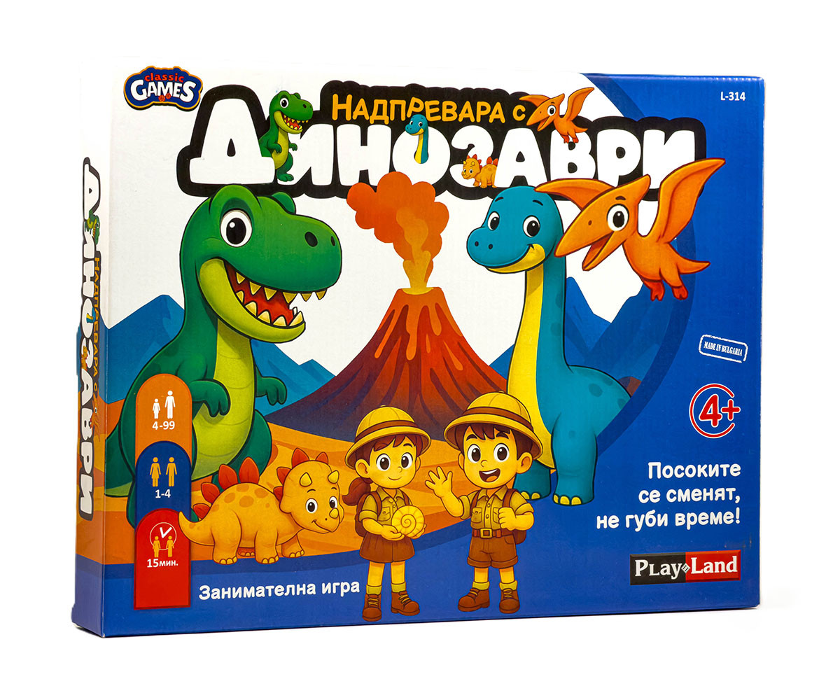 „Надпревара с динозаври“ е динамична игра за деца над 4 години, като в нея могат да участват 1-4 играчи. Играчите ще разполагат с игрални фигури-динозаври, които ще трябва да поставят на правилни позиции и в правилни посоки, спрямо инструкциите на картата. Играта подпомага развитието на координация между ръцете и очите, вниманието и бързите реакции на малчуганите. Продължителност: 15 минути.