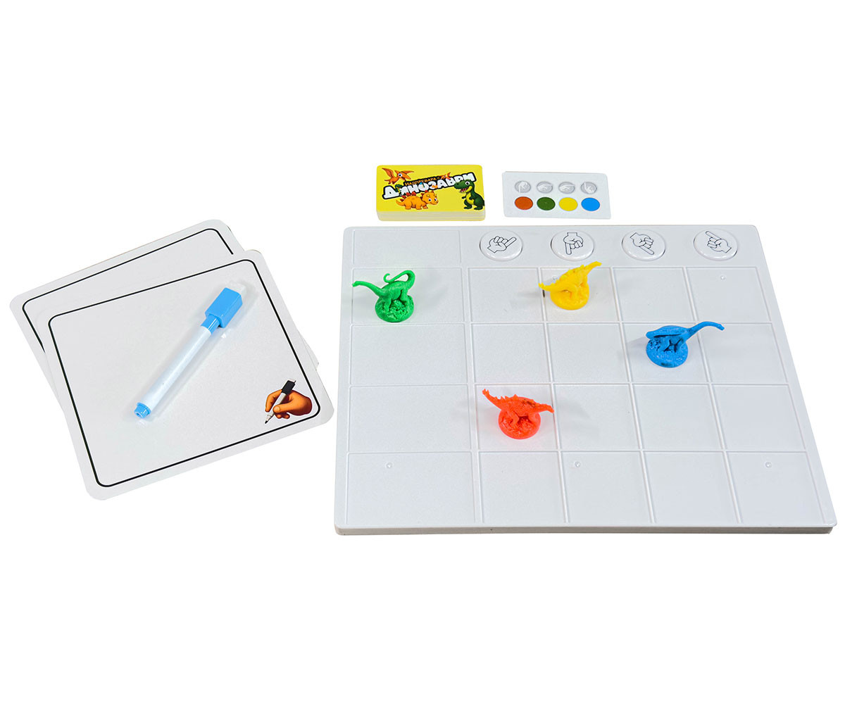 - 4 броя игрални фигури - динозаври;