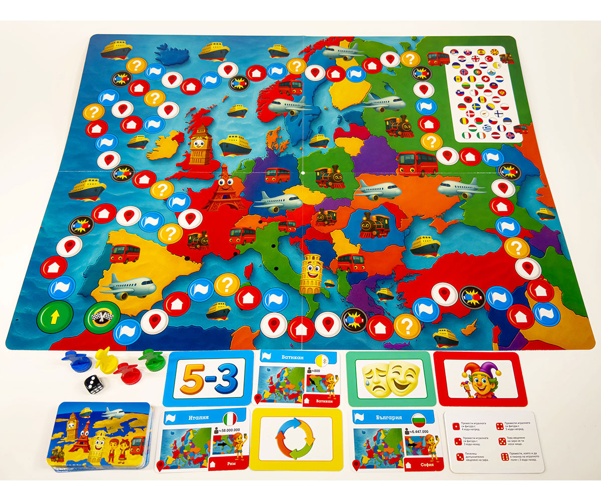 Тази образователна и забавна настолна игра ще тества твоите знания по география, докато се надпреварваш с останалите играчи по картата на Европа! Посочвай знамена, разпознавай държави и назовавай столици, за да преминаваш напред. Изтегли карта и отговори правилно, за да продължаваш напред или изпълни специално забавно предизвикателство! Ти и знанията ти срещу опонентите. Ще бъдеш ли първият играч, пресякъл финала? Играта е предназначена за деца над 8 години и възрастни, като в нея могат да участват 3-4 играчи. Продължителност: 20 минути.