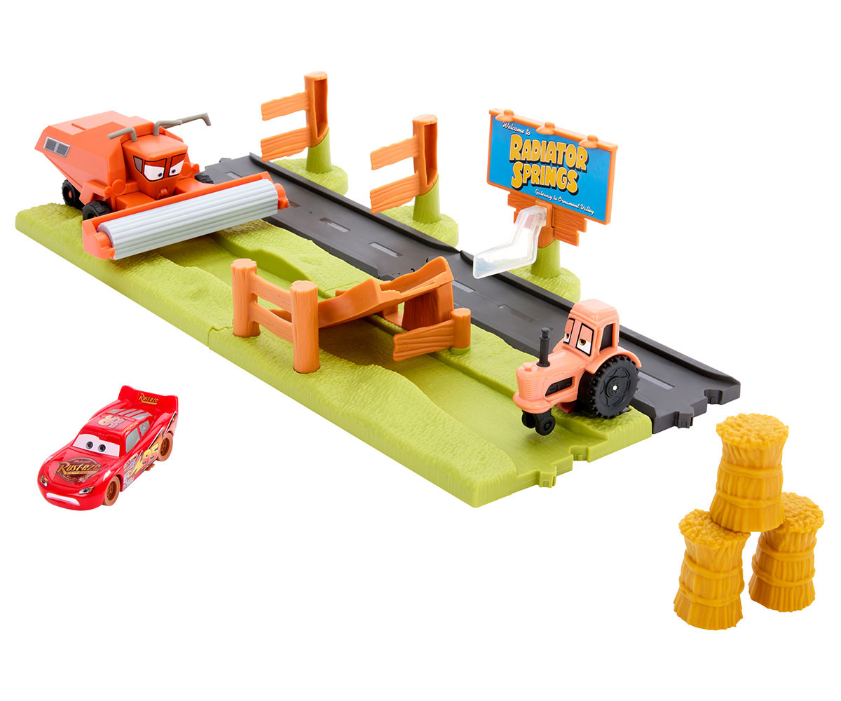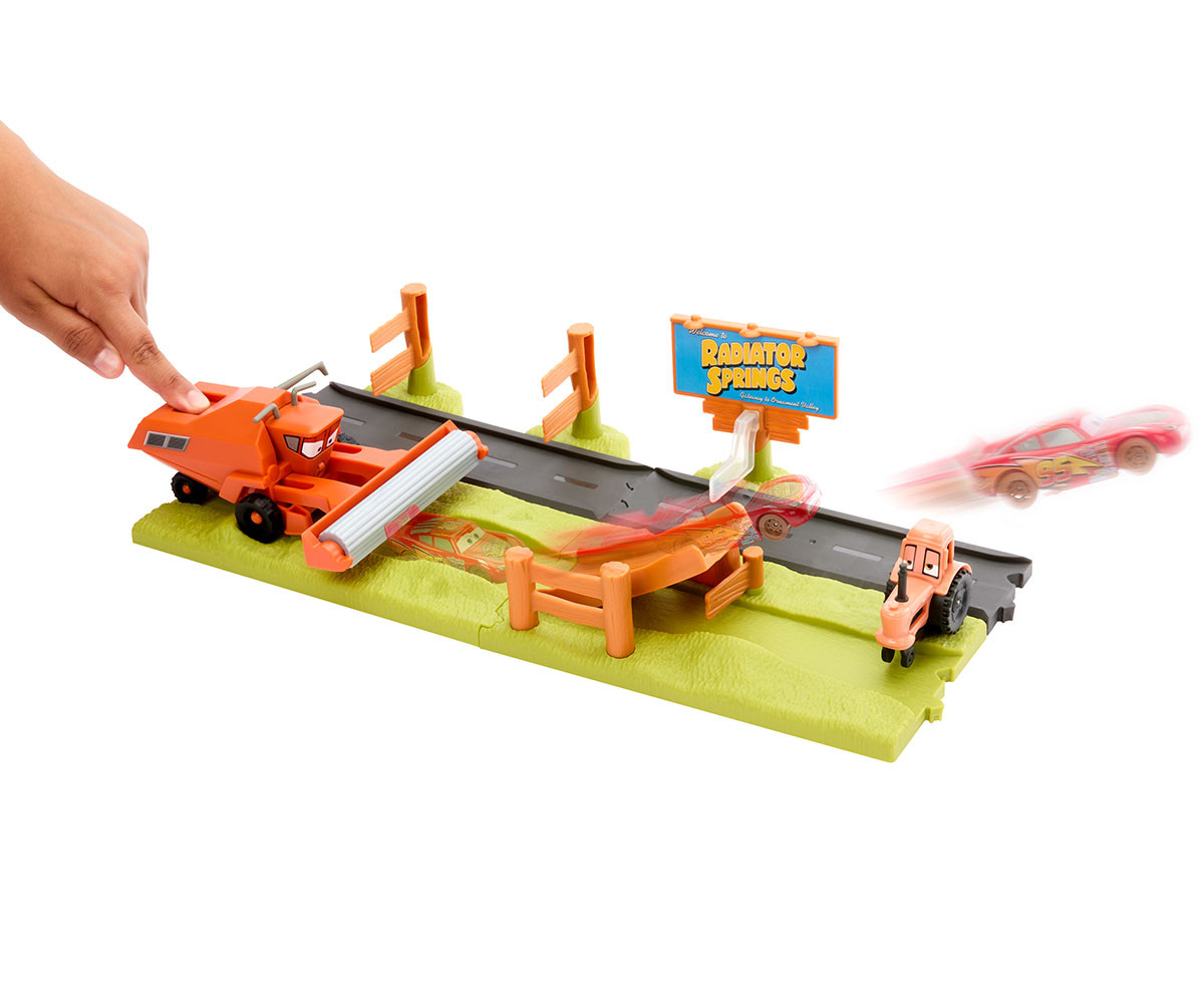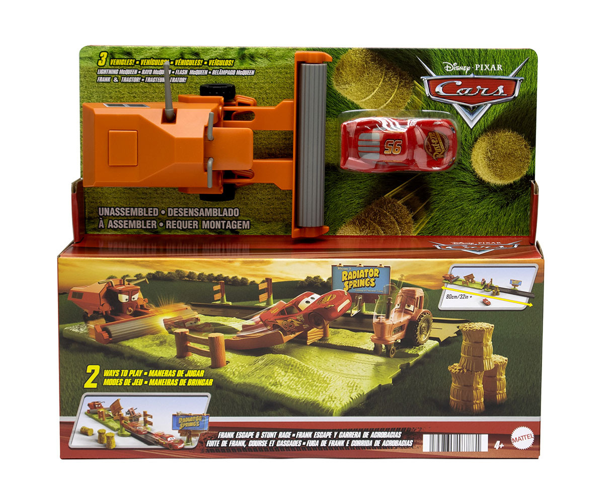 С игралния комплект „Бягство от Франк и каскадно състезание“ с три героя от Disney и Pixar „Колите“, децата могат да пресъздадат една от най-емблематичните сцени от филма в изпълнено с екшън приключение! Помнете – преобръщането на трактори е забавно… докато не се появи Франк!