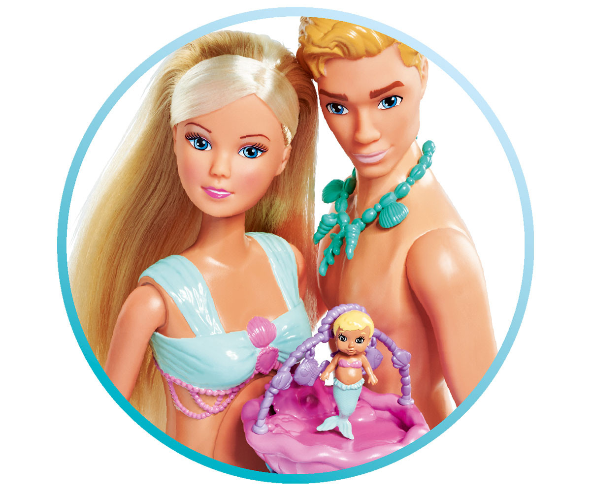 Steffi Love е истинска модна кукла. Тя обича модерните прически, своята малка сестричка Еви и, разбира се, приятеля си Кевин. Момичетата могат да стилизират куклата според най-новите модни тенденции. Стефи омагьосва като бременна русалка, чието бебе може лесно да бъде извадено от коремчето ѝ и така да се „роди“. До нея е Кевин като русал. Стефи и Кевин се грижат за своето бебе. След раждането то може да бъде поставено в малкото легълце във формата на мида.
