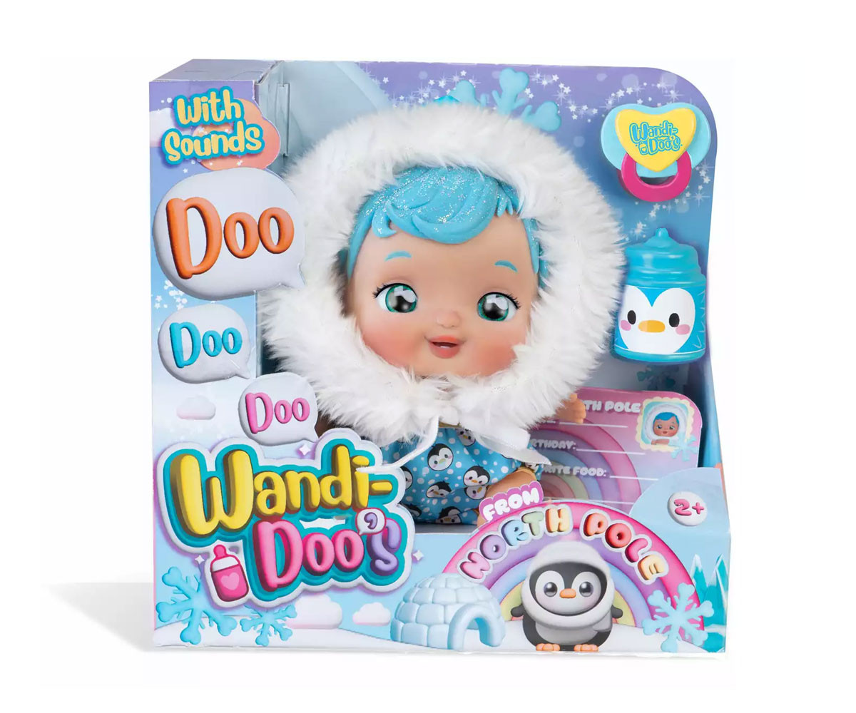 - Wandi-Doo от Северния полюс общува на универсалния език на бебетата, казвайки „ду, ду, ду“. Това прелестно бебе показва емоции – смее се, ядосва се и се прозява, когато е уморено, предлагайки интерактивно и реалистично преживяване;