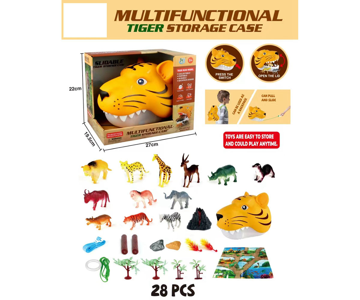 Открийте дивия свят на животните с този впечатляващ мултифункционален комплект с кутия за съхранение във формата на тигър! Забавна и практична, кутията служи както за съхранение, така и като част от играта. Комплектът включва 28 части - разнообразни диви животни, аксесоари и елементи за създаване на истински приключения в саваната. Ярките цветове и детайлната изработка правят играта още по-реалистична и увлекателна. Кутията може да се използва и като раница или да се дърпа, което я прави удобна за пренасяне навсякъде. Всички елементи могат лесно да се съхраняват вътре, осигурявайки ред и удобство.