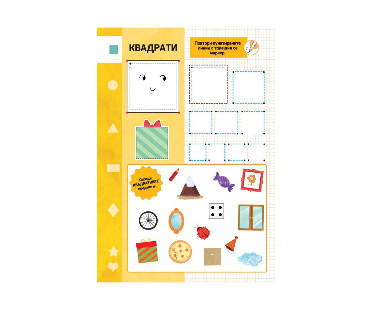 Ромбове, триъгълници и квадрати! Опознаването на формите никога не е било толкова пъстро и забавно! Занимателните задачи и веселите илюстрации провокират любопитството и любознателността. А благодарение на триещия се маркер, включен в книгата, детето може да се упражнява до безкрай, без да се притеснява да поправя и да започва отначало. Пъстри илюстрации, забавни задачи и възможност за безкрайни повторения! С помощта на триещия се маркер, включен в книгата, вашето дете ще може да се упражнява отново и отново. Когато приключи с дадена страница, просто изтрийте написаното и готово! Така малчуганите неусетно развиват своята фина моторика и координация и правят уверени първи стъпки в обучението по писане.