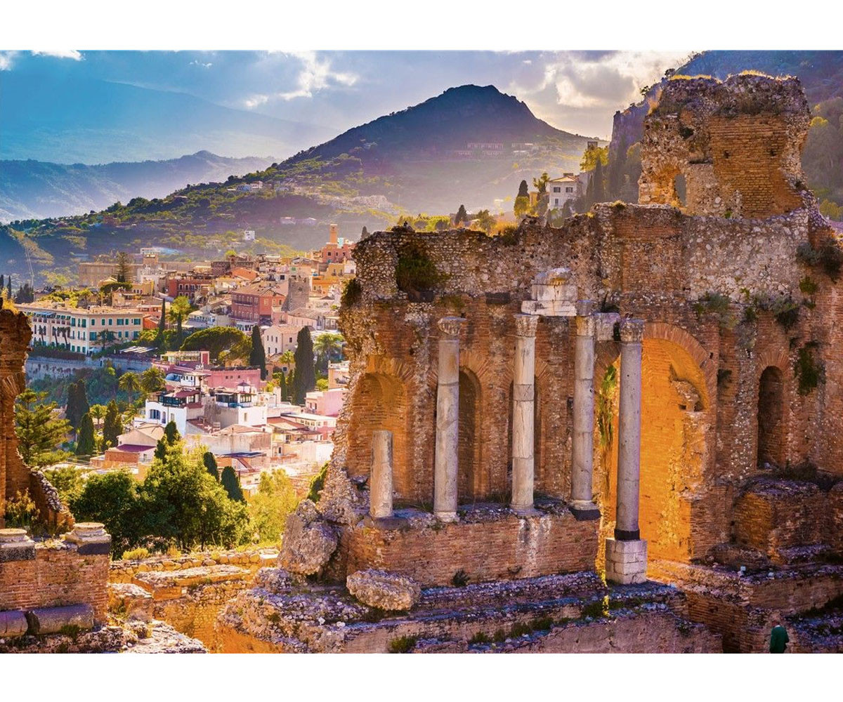 Красив пъзел с въздействащо изображение в реалистичен стил, което пресъздава руините на древен гръцки театър в Таормина, Сицилия. Златистите колони при залез се извисяват над живописен град, разположен по склоновете на планината. Атмосферата е спокойна и топла, а усещането - носталгично и хармонично. Подредете тази средиземноморска сцена и се потопете в красотата на историята. Пъзелите са забавен начин да тренирате ума и да стимулирате въображението както при деца, така и при възрастни. Насладете се на подреждането на всяко парче и развийте своята креативност!