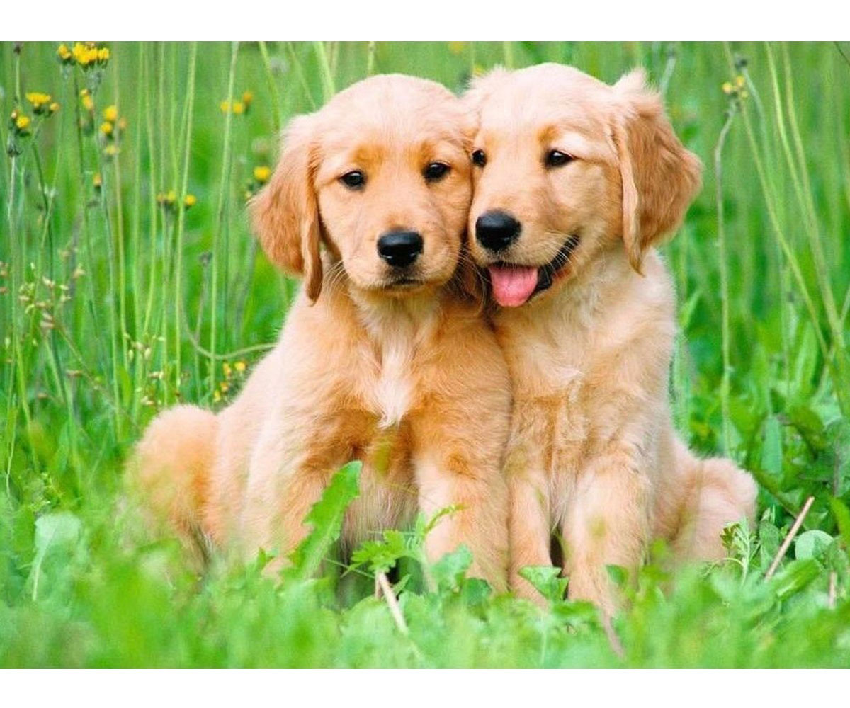 Сглобете очарователна сцена с две кученца порода Голдън ретривър, седнали едно до друго в зелена поляна. Тяхната спокойна поза, изпълнените с привързаност погледи и златистата им козина улавят истинската същност на кучешката нежност. Този пъзел е ода на природата, приятелството между животните и простите, искрени моменти.