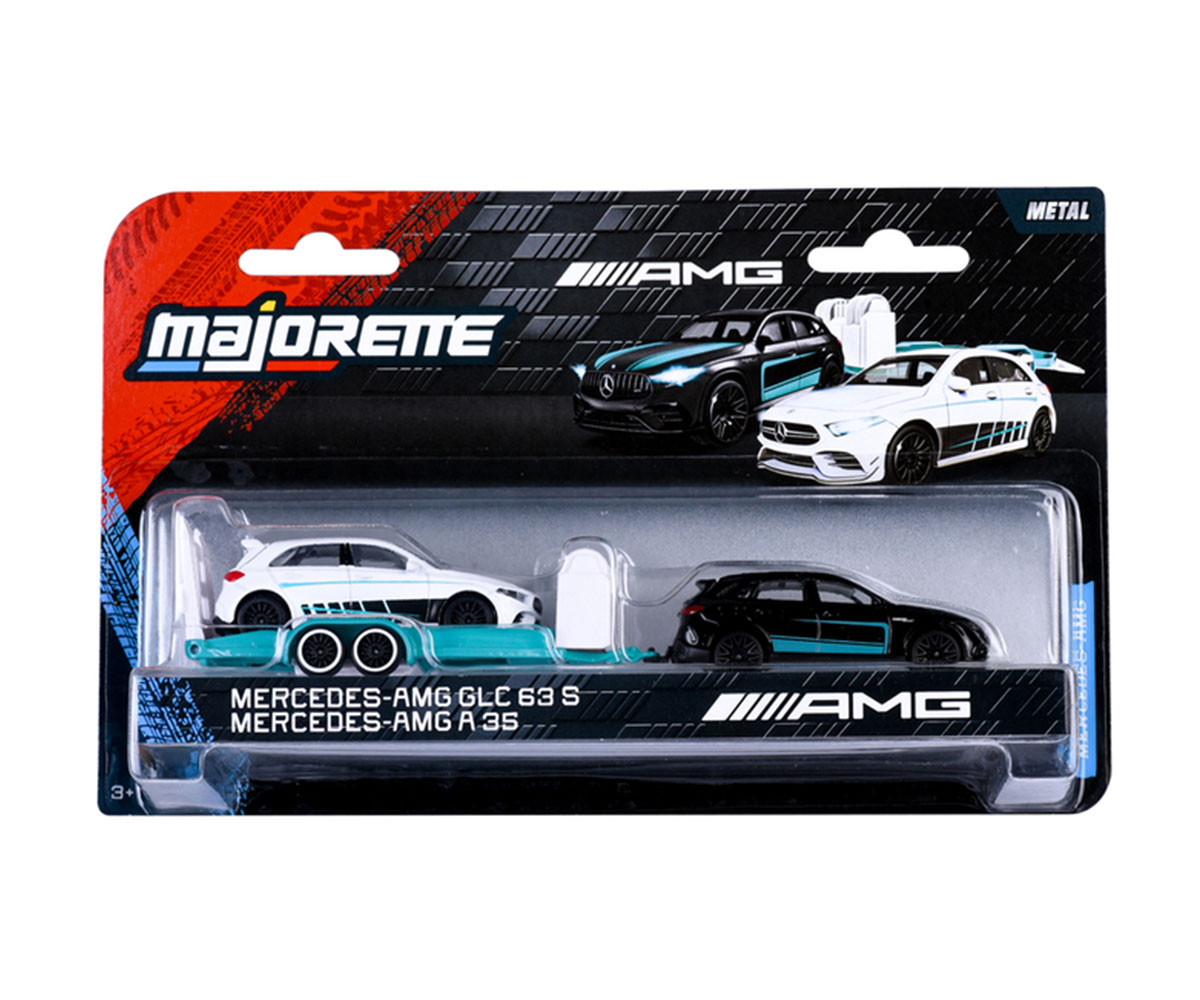 Потеглете към нови приключения с луксозния комплект Mercedes-AMG Deluxe Trailer от Majorette! Този впечатляващ сет включва 2 метални автомобила Mercedes-AMG и ремарке, създадени за стилен транспорт и динамична игра. Единият автомобил служи като теглещо превозно средство, докато другият се качва върху ремаркето чрез подвижна рампа. Перфектен за разходки до състезателната писта или гаража - този мощен екип няма да остане незабелязан!